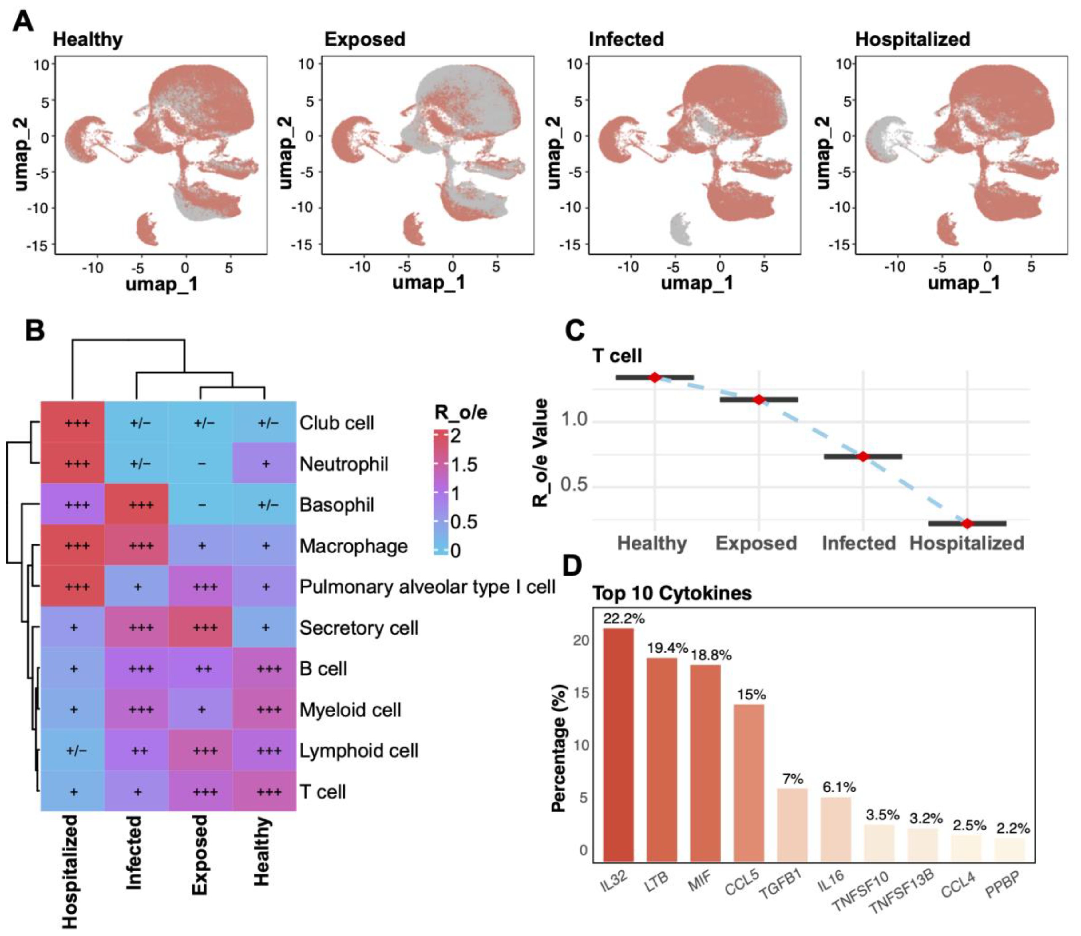 Figure 2. Cell enrichment and key factor analysis across groups. (A) UMAP plots for the four groups (Healthy, Exposed, Infected, Hospitalized). (B) Heatmap of relative enrichment (Ro/e) for cell types by group. Colors from blue to red reflect enrichment levels; “+” and “–” indicate significant increases or decreases. (C) Line plot illustrating the relative enrichment values (R_o/e) of T cells across the four groups, with red points indicating mean values and error bars representing standard deviation. (D) Bar plot of the top 10 cytokines’ distribution, highlighting IL32, LTB, and MIF as the most abundantly expressed cytokines across groups.