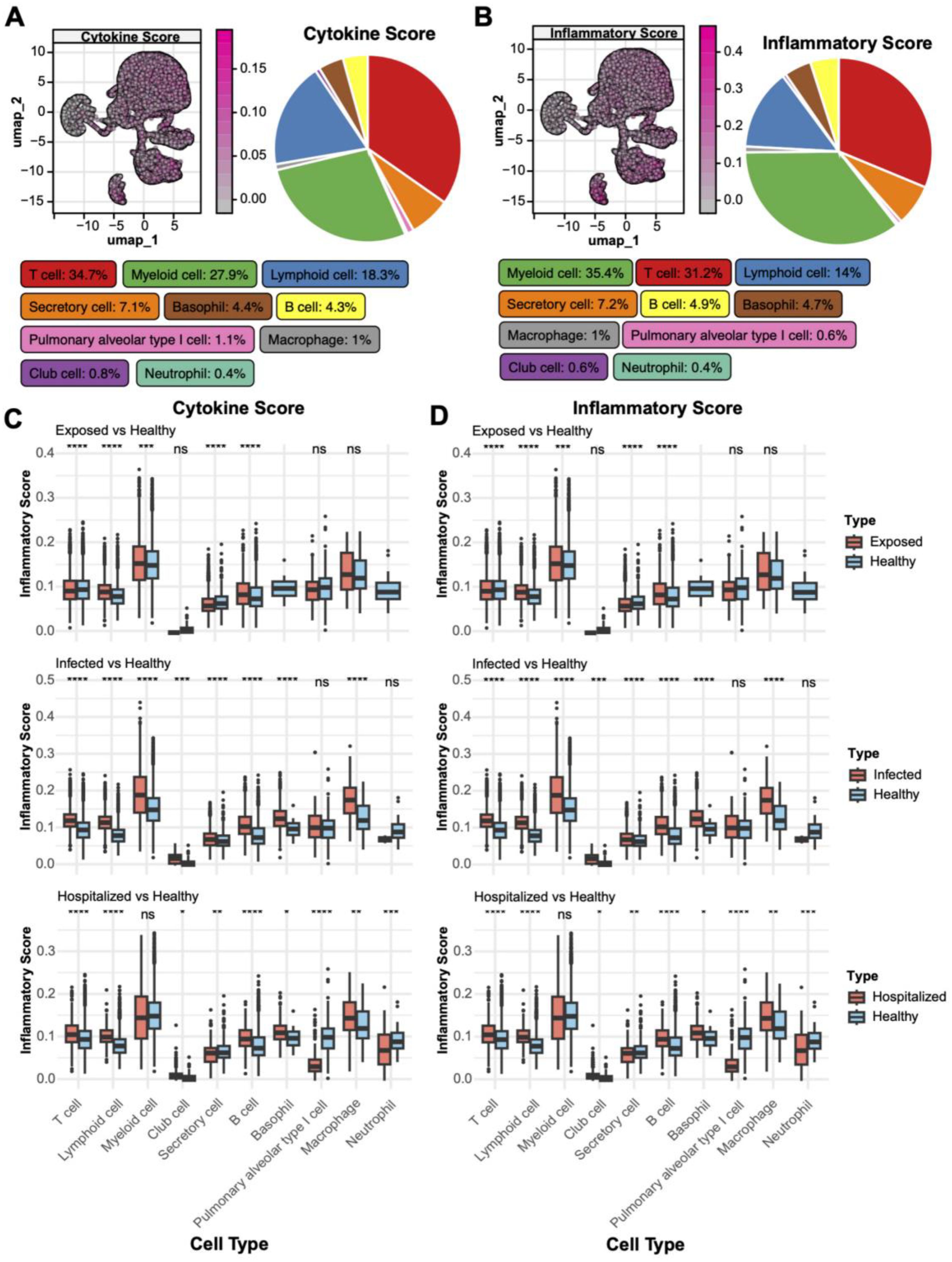 Figure 3. Distribution of cytokine and inflammatory scores. (A) UMAP plot of cytokine score spatial distribution, with color gradients indicating score intensity. The pie chart on the right shows the proportion of different cell types within the total population. (B) UMAP plot of inflammatory score distribution with a similar pie chart for inflammatory scores. (C) Boxplots comparing cytokine scores across cell types in Exposed, Infected, and Hospitalized groups versus Healthy controls (*p < 0.05, **p < 0.01, ***p < 0.001, ****p < 0.0001; ns, not significant). (D) Boxplots showing inflammatory score differences among cell types across the groups.
