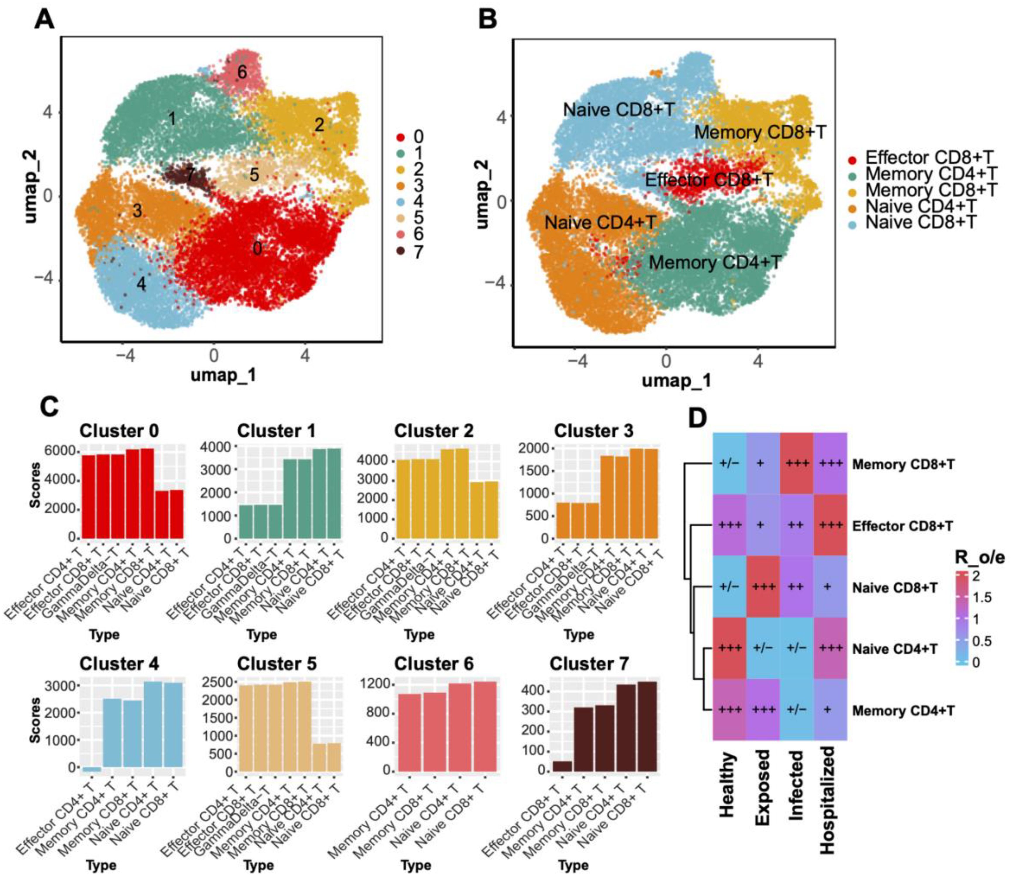 A panel of visualizations depicts immune cell clustering and analysis. Panel A shows a UMAP plot displaying clusters 0-7 in various colors. Panel B assigns immune cell types to these clusters. Panel C presents bar graphs of scores for each cluster, detailing immune cell types. Panel D is a heatmap showing expression levels of different T cell types across health states: healthy, exposed, infected, and hospitalized, with a color gradient indicating expression levels.