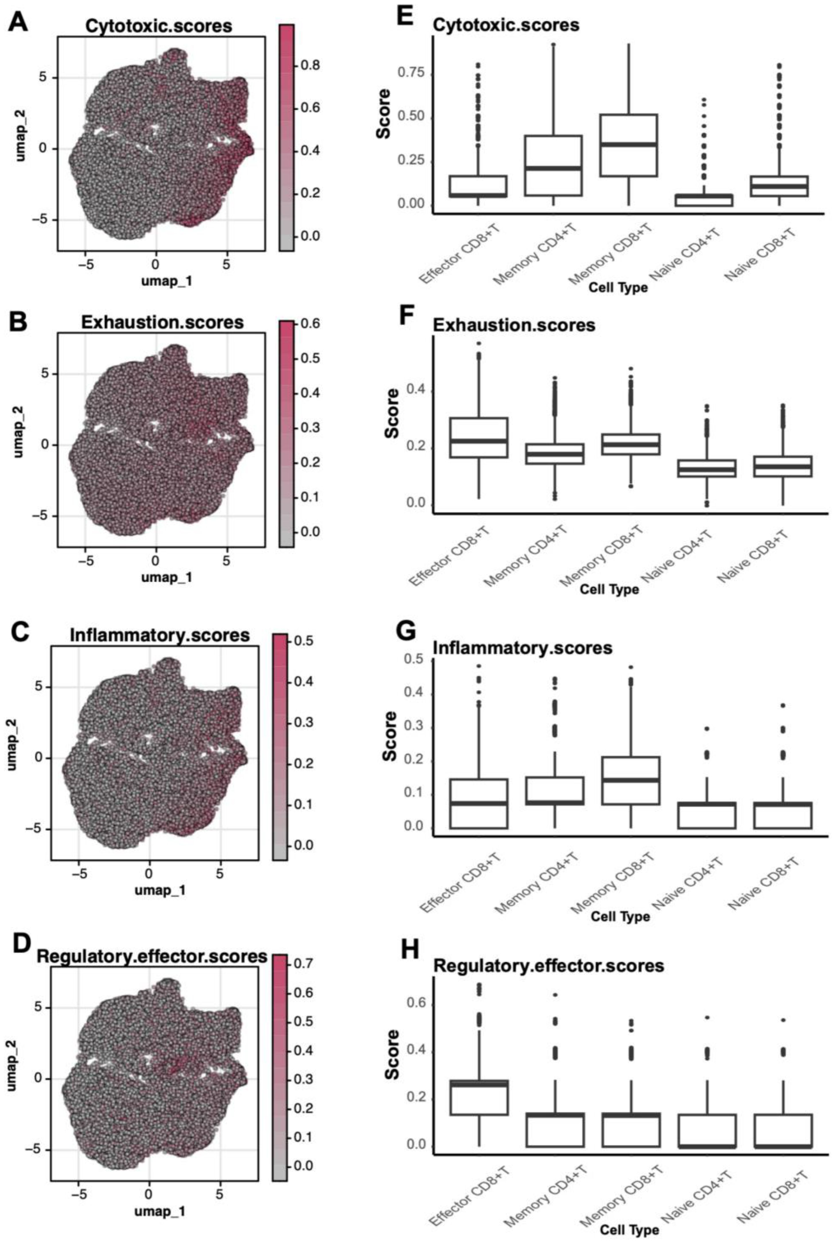 Graphs comparing scores of different cell functions. Panels A, B, C, and D show UMAP plots with varying intensities of cytotoxic, exhaustion, inflammatory, and regulatory effector scores. Panels E, F, G, and H display box plots correlating these scores across effector and memory CD8+ T, memory and naive CD4+ T, and naive CD8+ T cell types. Color bars indicate score scales.