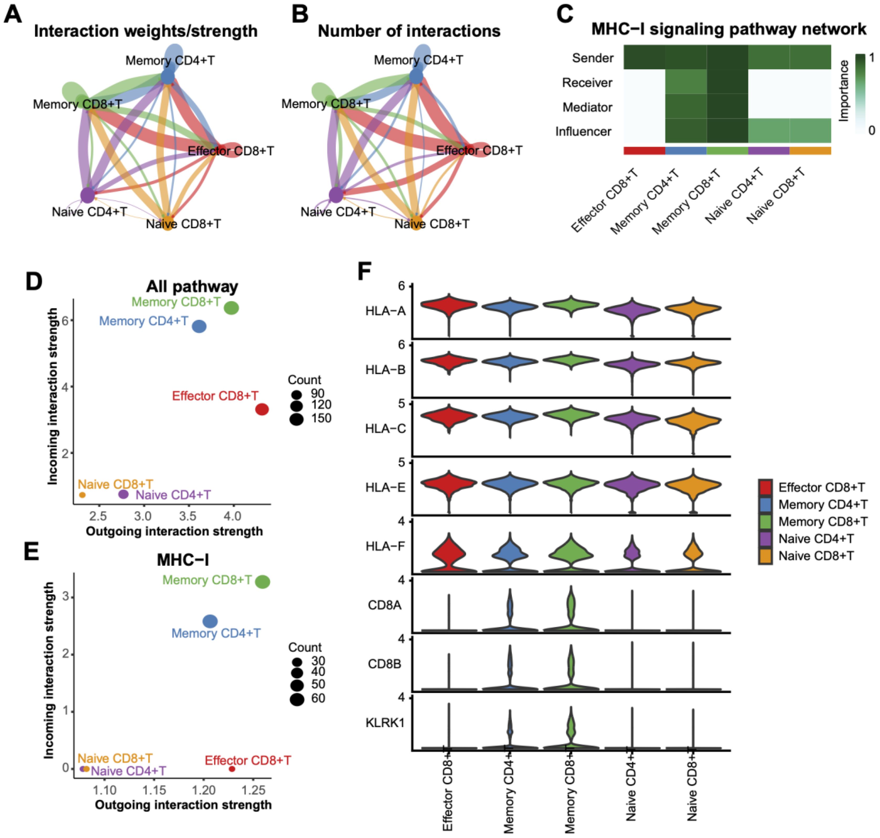 Figure 6. Interaction analysis between T Cell subtypes. (A) Interaction weight/intensity network based on all pathways, showing interaction strengths between T cell subtypes. Line color indicates interaction direction, and line thickness represents intensity. (B) Network plot of interaction counts between T cell subtypes. (C) Role-based heatmap of T cell involvement in MHC-I pathway signaling, with communication importance scaled from 0 to 1. (D) Scatterplot of interaction weights across all pathways, with dot sizes representing interaction counts. (E) Distribution of interaction weights based on the MHC-I pathway, highlighting the dominance of memory CD8+ T cells in interactions. (F) Violin plots of MHC-I pathway-associated gene expression levels across T cell subtypes.