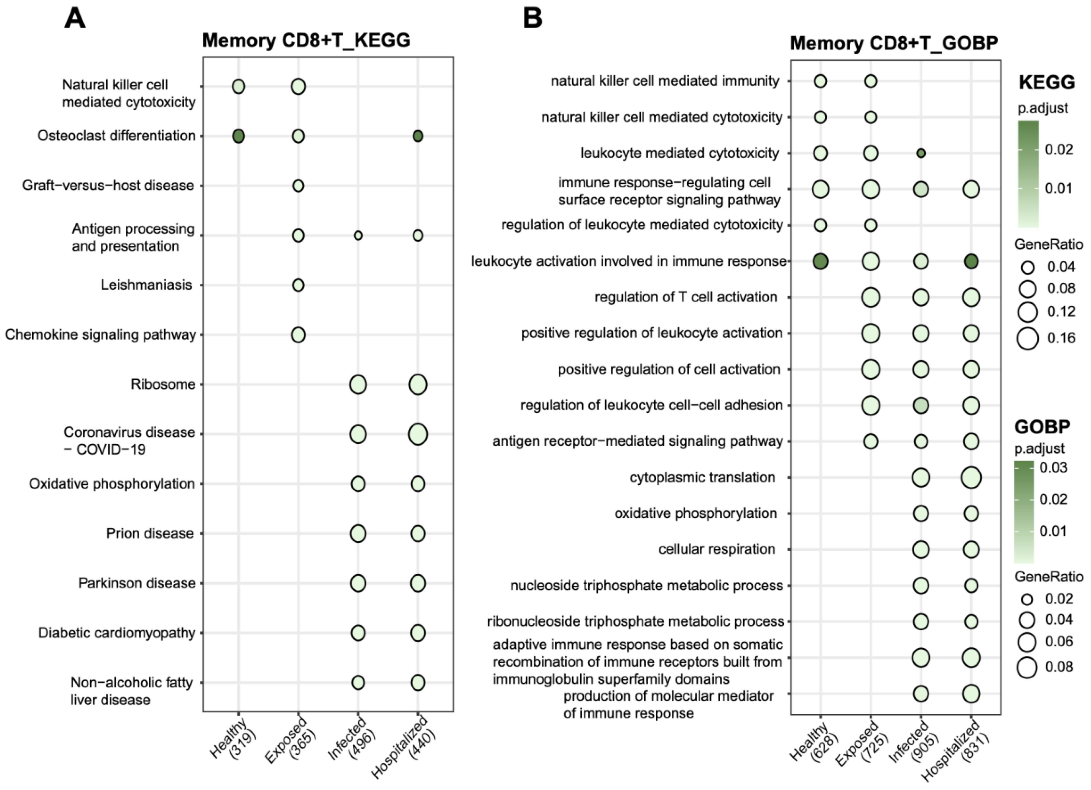 Dot plots show gene set enrichments for memory CD8+ T cells in different conditions using KEGG and GOBP pathways. Plot A (left) displays terms like osteoclast differentiation and COVID-19 with varying gene ratios. Plot B (right) highlights immune and metabolic processes. Color intensity represents p-values: darker shades indicate lower values. Gene ratios are shown by dot size. Conditions are categorized as Healthy, Exposed, Infected, and Hospitalized.