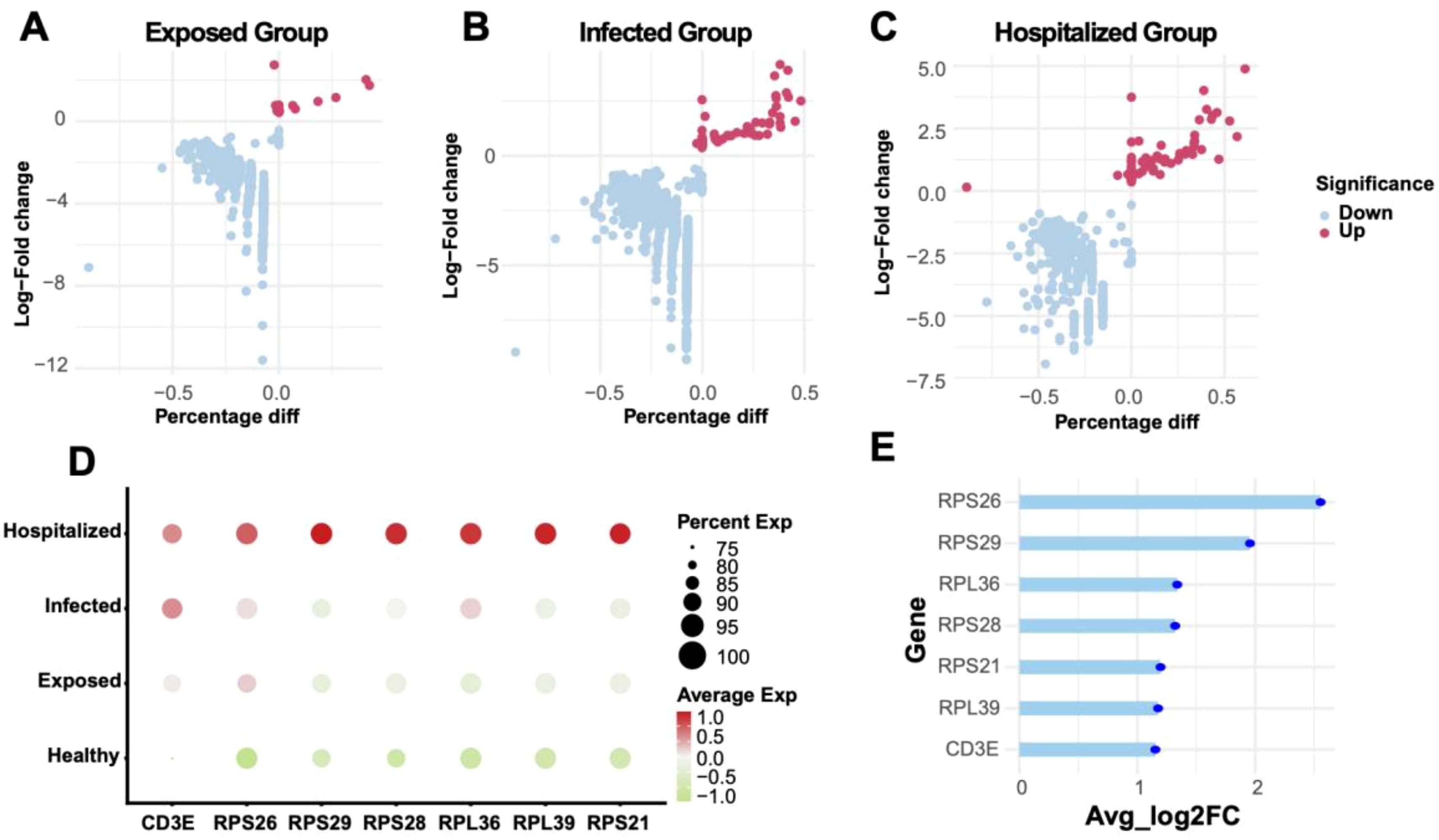 Graphs A, B, and C show log-fold changes versus percentage differences for Exposed, Infected, and Hospitalized groups, with significant differences marked in shades of red and blue. Graph D is a bubble plot illustrating gene expression percentages and averages across Healthy, Exposed, Infected, and Hospitalized groups. Graph E presents a bar graph of average log2 fold changes for genes, highlighting RPS26 with the highest value.