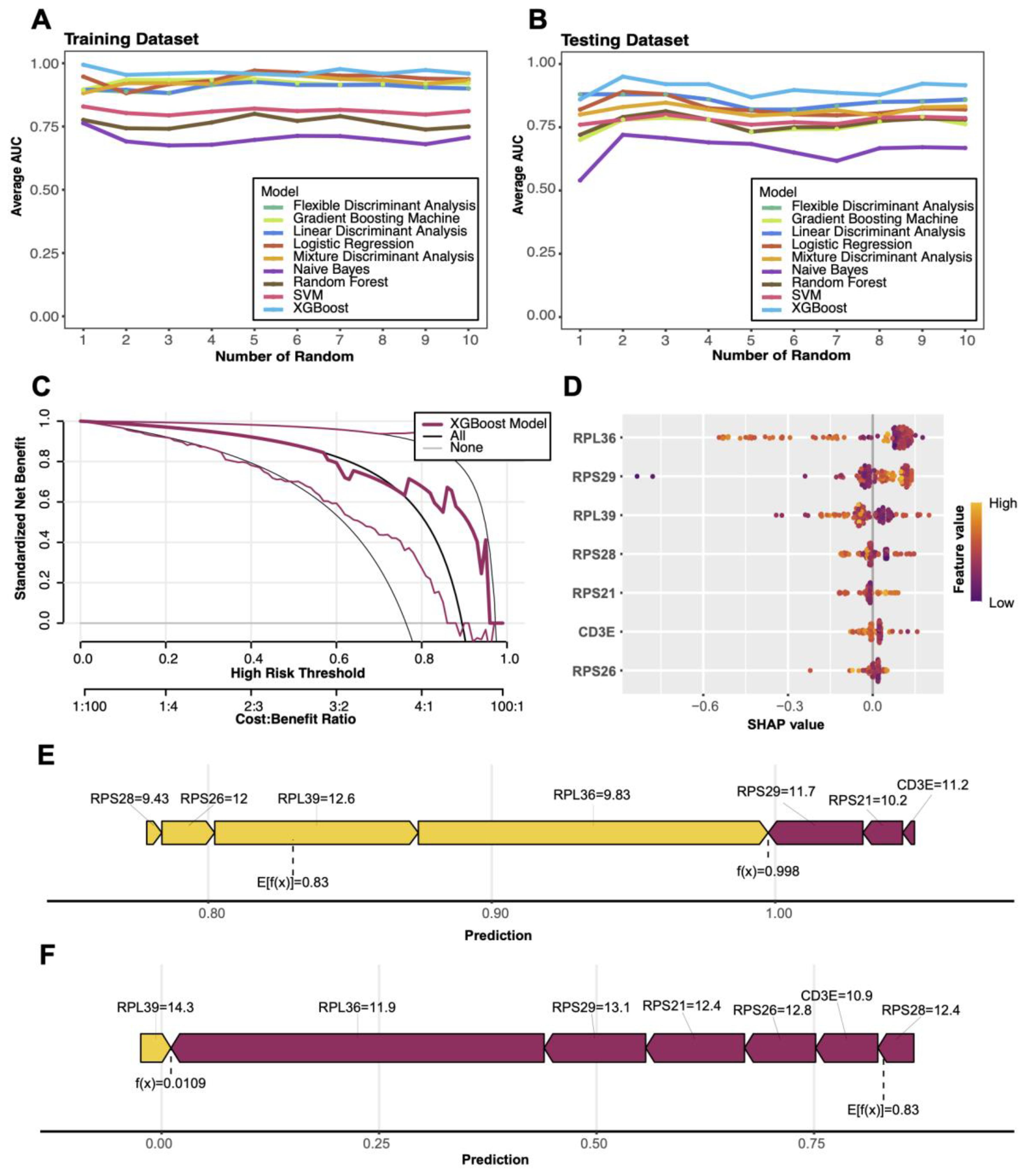 Graphs showing model performance and SHAP analysis. (A) and (B) depict average AUC scores across multiple models for training and testing datasets. (C) shows a decision curve analysis for the XGBoost model. (D) displays SHAP values indicating feature importance. (E) and (F) are model prediction explanations with contributions from various features such as RPS29 and RPL39.