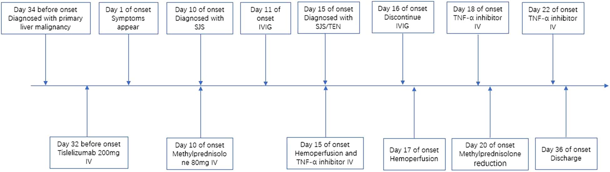 Timeline of medical events for a patient: Diagnosed with primary liver malignancy on 2025-05-07. Received Tislelizumab on 2025-05-09. Symptoms appear on 2025-06-12. Diagnosed with SJS/TEN on 2025-06-22, treated with Methylprednisolone. IVIG administered on 2025-06-23, discontinued on 2025-06-28. Hemoperfusion and TNF-α inhibitor administered on 2025-06-27 and 2025-06-29. TNF-α inhibitor IV administered again on 2025-06-30 and 2025-07-04. Methylprednisolone reduced on 2025-07-02. Discharged on 2025-07-18.