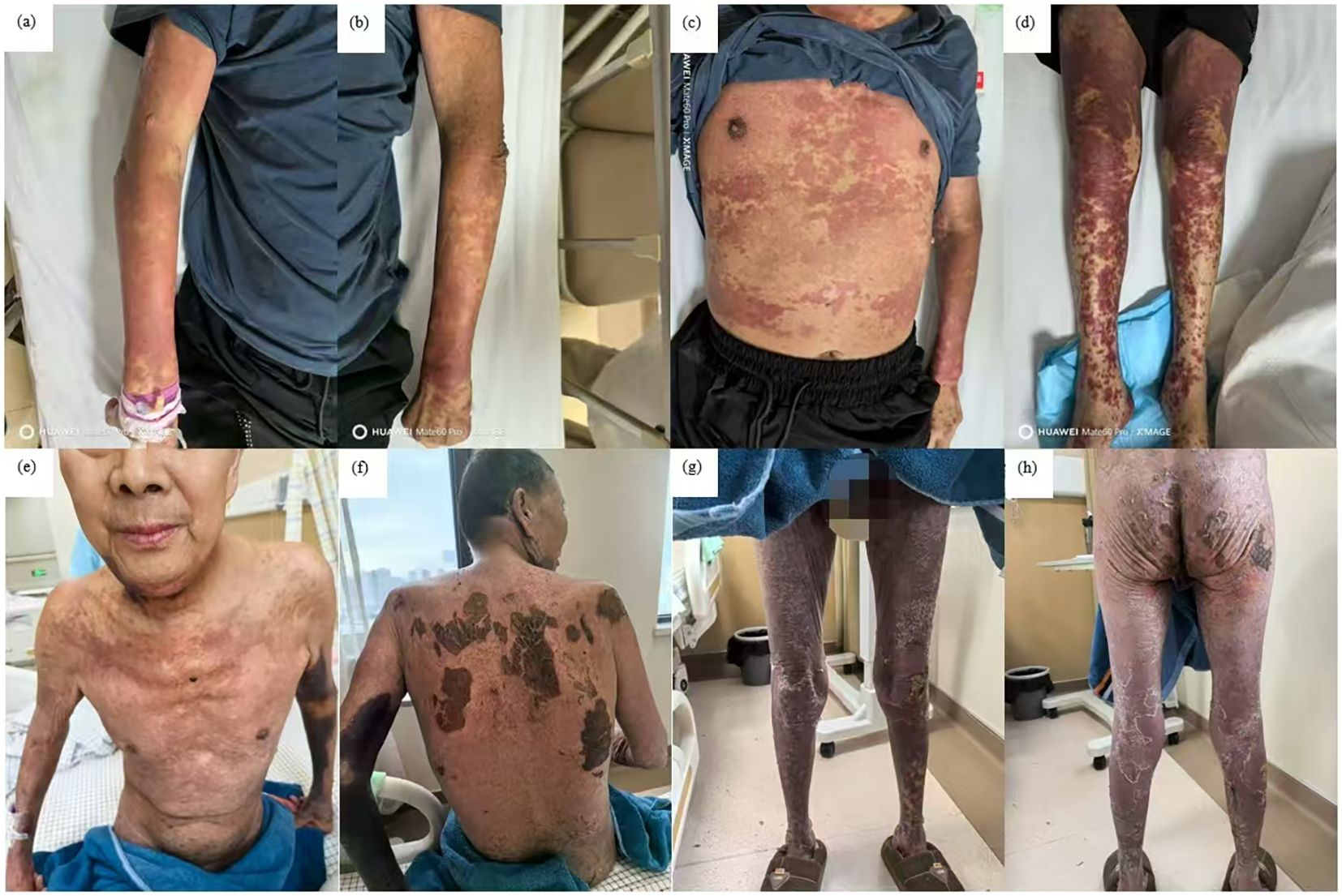 Figure 2. Improvement of skin lesions. Day 1: erythema all over the entire body and scattered blisters and bullae on the limbs (a-d); day 16: widespread erythema gradually faded with re-epithelialization (e-h).