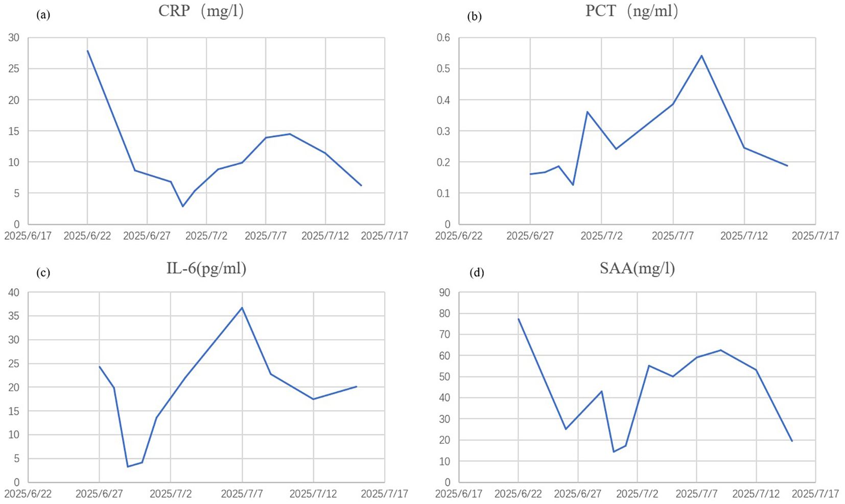 Four line graphs showing levels of biomarkers over time. (a) CRP decreases significantly from June 17, 2025, until July 17, 2025. (b) PCT shows a peak around July 7, 2025. (c) IL-6 increases sharply and peaks before July 7, 2025. (d) SAA declines drastically and shows fluctuations until July 17, 2025.