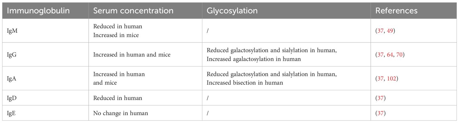 Aging significantly influences B cells, which can be reflected by the changes of Ig levels. Although serum IgE remains stable, the concentrations of switched Ig (IgA and IgG) exhibit increased expression in the human elderly, while IgM and IgD are reduced with age (37). This change implies a transition from naïve to memory B cells and impaired response to new antigens (38). Interestingly, the level of total serum Ig shows no difference or a mild elevation with advanced age in human (39, 40). In addition, the glycosylation of Ig can also be altered with age, which plays an important role in aging and age-related diseases (Table 1). The following sections will review age-related changes in different Ig classes, and go a step further to discuss the underlining mechanism, which will be helpful in understanding the complexity of Ig in aging.