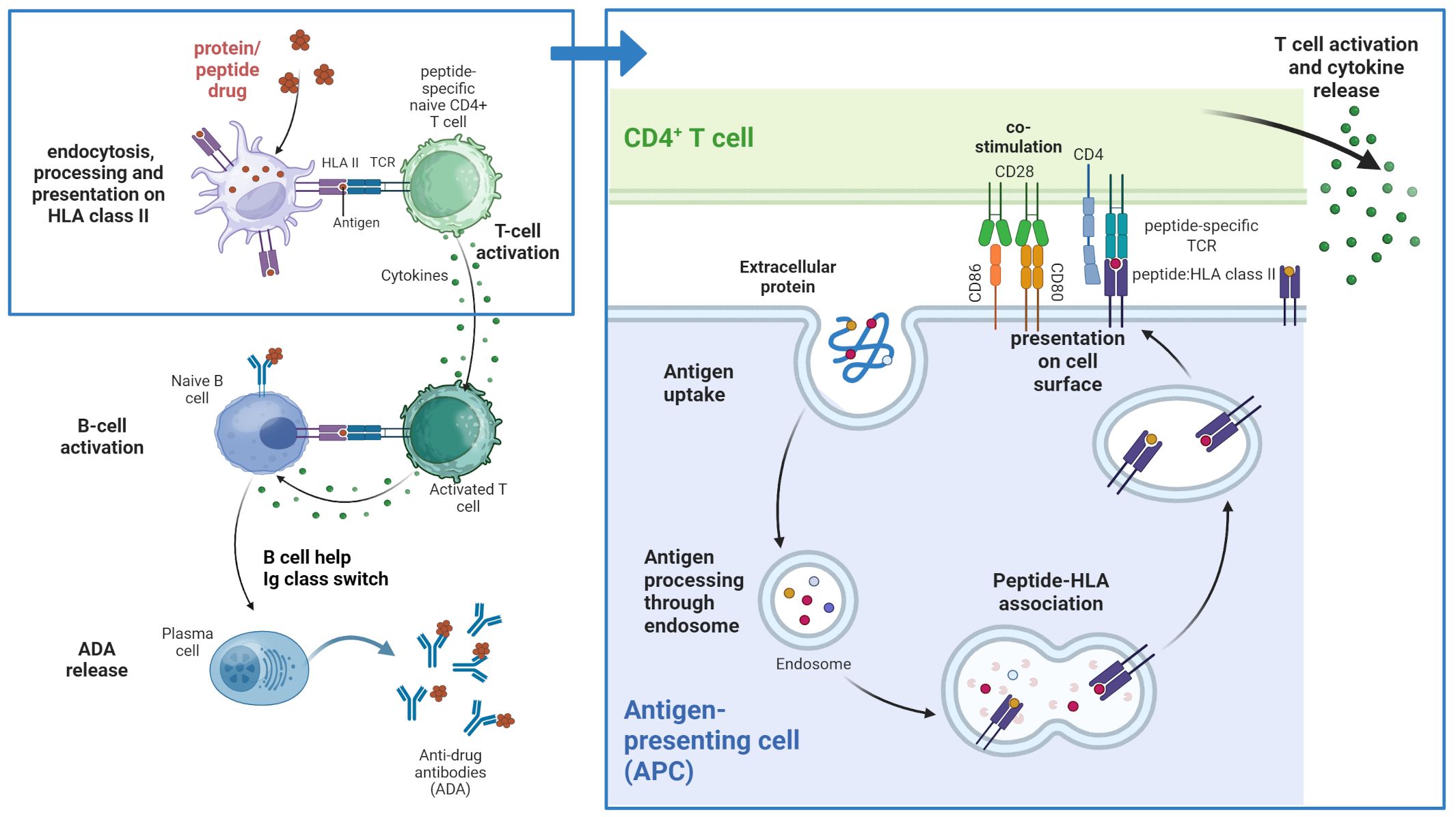 Figure 1. T cell-dependent immunogenicity. Peptide and protein therapeutics are taken up by professional antigen presenting cells (APCs) and processed in the endolysosome where peptides are bound to peptide-specific HLA class II molecules. The peptide:HLA complexes are presented on the surface of the APC where they can potentially be recognized by T cells with corresponding peptide-specific T cell receptors. This recognition and additional interaction of co-stimulatory molecules leads to activation of the T cell and cytokine secretion which in turn can lead to B cell activation and Ig class switch and subsequently the release of anti-drug antibodies (ADAs). Created in BioRender. Karle, A. (2025) https://BioRender.com/z1efgeo.