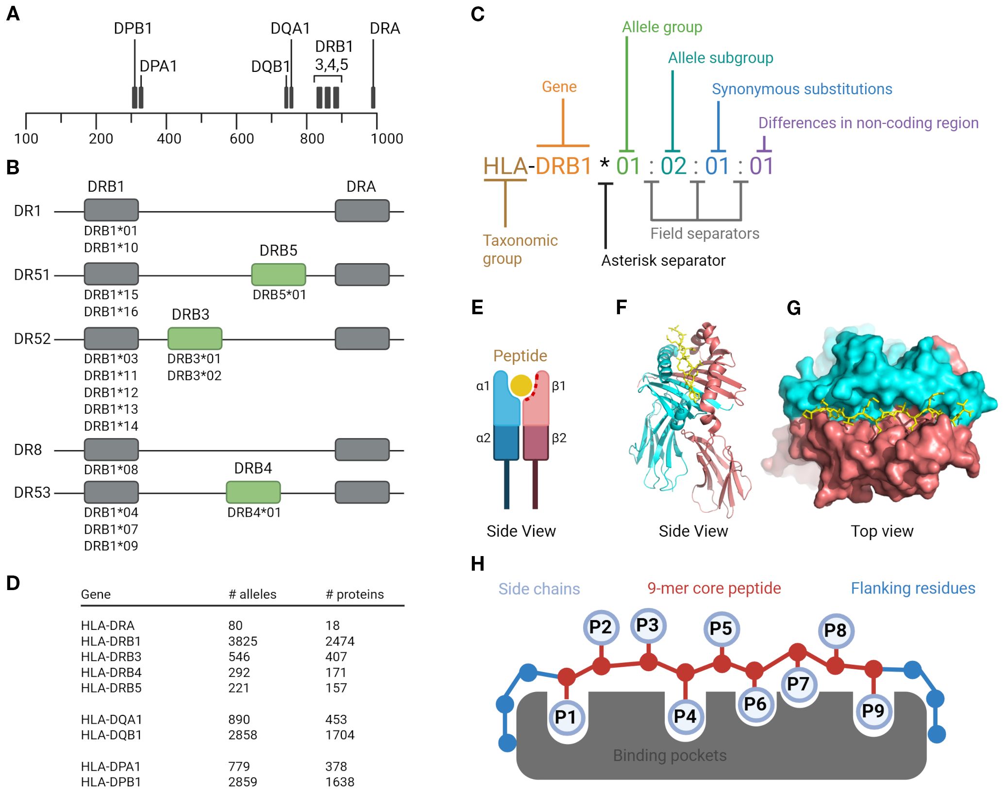 Figure 2. Human leukocyte antigen class II system. HLA class II molecules are composed of three types: two HLA-DR, one HLA-DQ, and one HLA-DP molecule per haplotype. Each molecule consists of a heterodimer formed by one α (alpha) and one β (beta) chain; (A) Gene localization of HLA class II. The DPA, DQA, and DRA genes encode the α chains, while the DPB, DQB, and DRB genes encode the β chains. The physical proximity of the DQ and DR gene loci contributes to linkage disequilibrium, resulting in frequent allelic associations between HLA-DQ and HLA-DR (e.g., HLA-DR15/HLA-DQ6); (B) Haplotype structure of HLA-DRB genes. Each haplotype expresses one HLA-DRB1 gene and, depending on the allele present at this locus, may also include an additional DRB3, DRB4, or DRB5 gene. These genes encode structurally similar but genetically distinct β chains. Importantly, the strong linkage disequilibrium between HLA-DRB1 and these additional DRB genes are highly stable across populations. For example, DRB1*15 is almost always co-inherited with DRB5, forming the DR15/DRB5 haplotype, while DRB1*03 is associated with DRB3, and DRB1*04 with DRB4; (C) Nomenclature of HLA; (D) HLA polymorphism and number of alleles and proteins (IPD-IMGT/HLA-database); (E) HLA class II molecule structure schematic view. The peptide-binding site is formed by the α1 and β1 domains of the α and β chains; (F) Side view of the crystal structure for HLA-DR1 (PDB ID 1DLH) shown in cartoon representation. The α chain is colored red and the β chain cyan; (G) Top view of the same structure shown in surface representation. The HA 306–318 peptide is depicted in stick representation. The α and β chains are shown in red and cyan, respectively; (H) Peptide binding mode. Amino acid side chains of anchor residues P1, P4, P6, P7 and P9 interact with corresponding binding pockets in the peptide binding groove. Created in BioRender. Karle, (A) (2025) https://BioRender.com/eb39tt4.