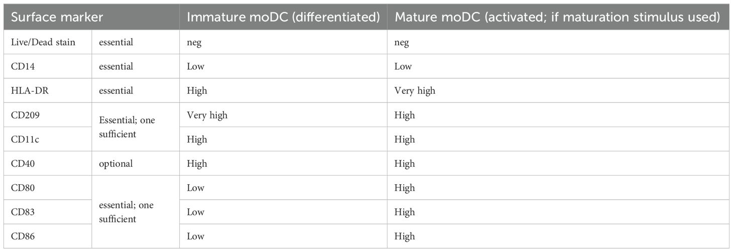 CD14+ monocytes are commonly isolated from PBMCs utilizing magnetic beads and many different brands are available with either positive or negative selection protocols. For quality control, it is important to characterize monocyte purity and phenotype after isolation via flow cytometry (Table 1). Monocytes should be highly viable (>90%), pure (percent CD14+ >90), high in CD14 expression with and low side scatter. Most laboratories in the EIP consortium differentiate monocytes to immature moDCs maintaining a cell density between 3E5-1E6 per mL. Assay medium containing 10% fetal bovine serum (FBS) is commonly used with success but often requires testing of different FBS batches as cell viability and antigen uptake may potentially vary. Human AB blood-type serum containing media and serum-free media have been applied successfully across different EIP labs as well, although differences in peptide presentation efficiency have been observed with the latter in comparison to FBS-containing media. Competition experiments indicate that high concentrations of Intravenous Immunoglobulin (IVIG) do not interfere with drug-peptide presentation (51), suggesting that proteins from FBS should not meaningfully compete with and impact the drug-derived antigen presentation profile. Culture medium should contain granulocyte-macrophage colony-stimulating factor (GM-CSF) and interleukin 4 (IL-4), both of which should be titrated to achieve fully differentiated moDCs. Medium does not require exchange during the differentiation phase, but some EIP labs replenish GM-CSF and IL-4 after a few days of cell culture. By ensuring that the differentiated immature moDCs are of high quality and properly characterized, researchers can obtain more reliable and reproducible results from their MAPPs assays. On the day of stimulation, commonly between days 5 and 7, the differentiation status must be verified via flow cytometry (Table 2). Viability should exceed a lower limit of 70% viability after excluding debris. Upon differentiation, immature moDCs should be low to negative in CD14. Moreover, a visible (positive) shift in forward/side scatter of cells should be observable, and cells should express CD11c and CD209 as classical DC markers. Immature cells should be low in expression of activation markers e.g., CD80, CD83, CD86, to ensure that cells are able to efficiently take up proteins from their surroundings, process them to peptides and present the peptides on HLA class II molecules. Pre-activated moDCs typically yield fewer drug-derived peptides and lead to overall lower assay sensitivity.