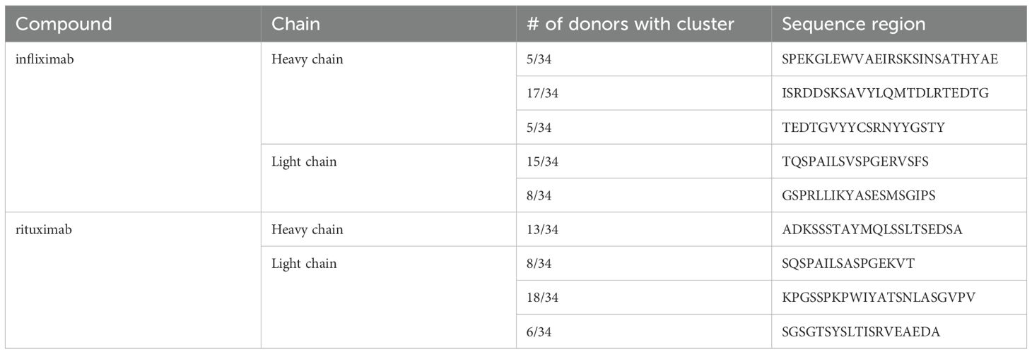 Table 4. Frequently observed sequence regions in infliximab and rituximab; Peptides summarized that bind to 15% of tested donors or above.