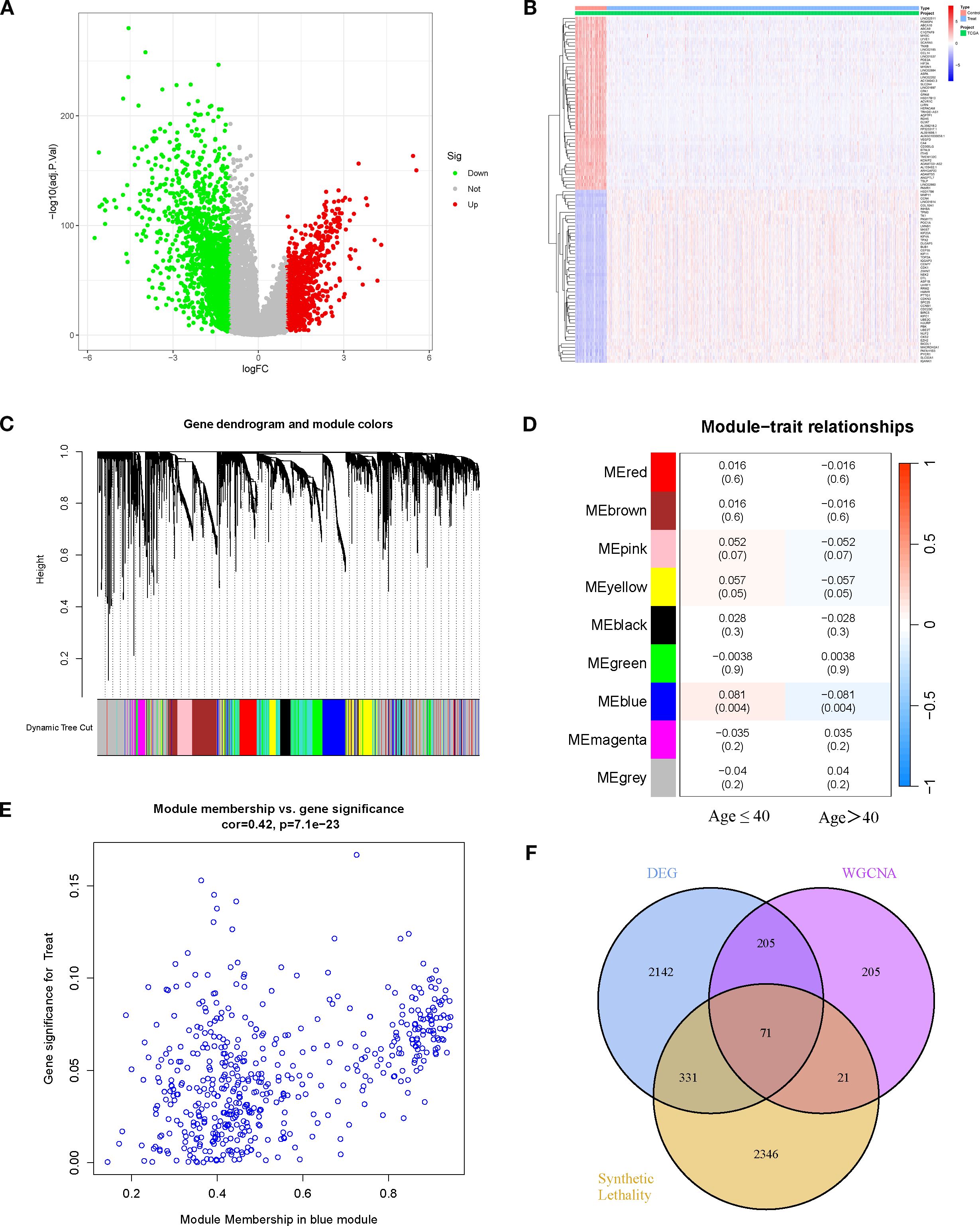 Figure 1. Differential expression analysis and WGCNA identifies potential key genes. (A) Volcano plot of DEGs (BRCA vs. normal). (B) Heatmap of DEGs between BRCA and normal tissues. (C, D) Gene modules identified by WGCNA and their correlations with age traits (≤40 years and >40 years). (E) Correlation between module membership of genes in the blue module and age traits. (F) Venn diagram showing the overlap among DEGs, WGCNA key module genes, and SL genes.