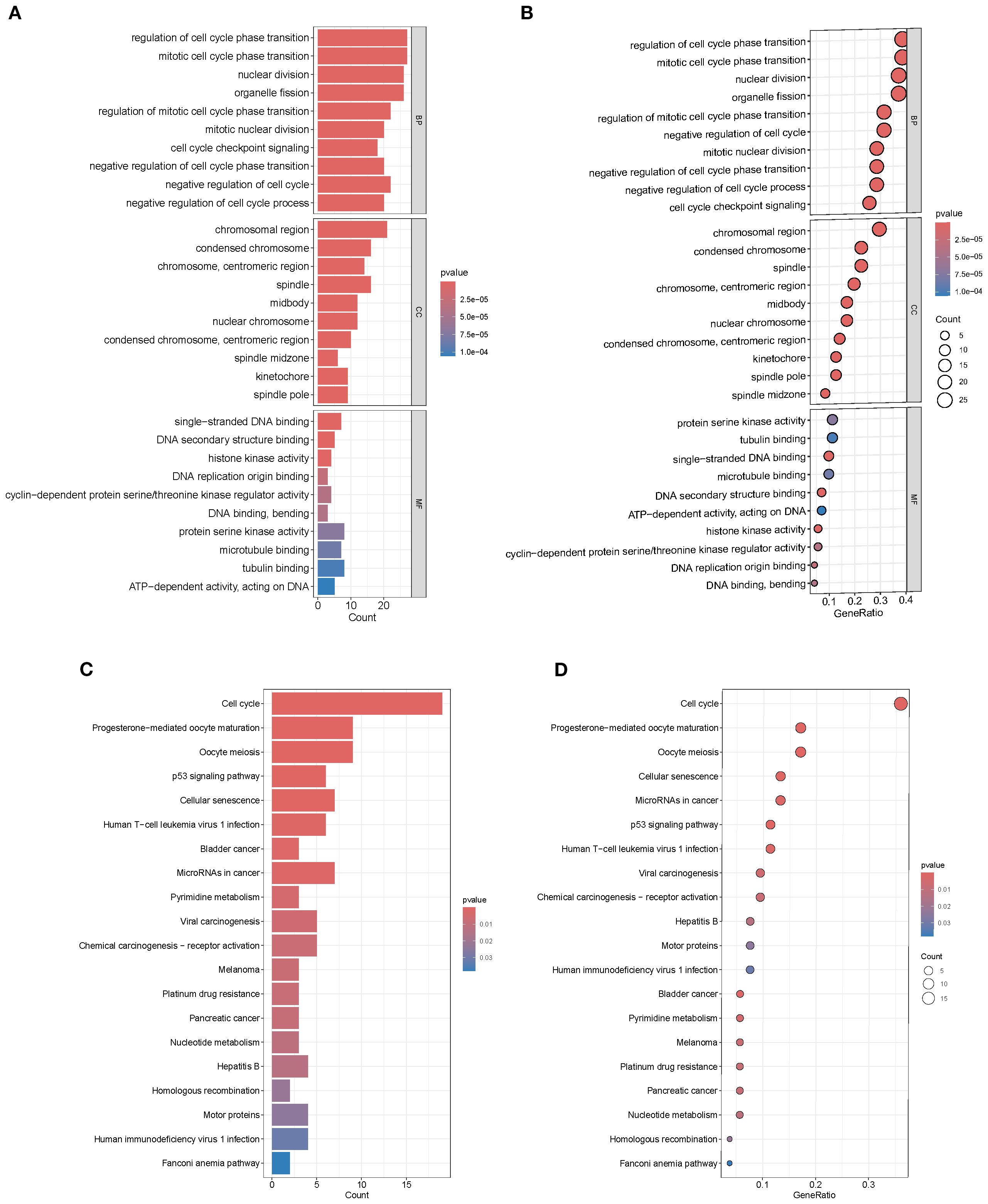 Figure 2. GO and KEGG enrichment analysis. (A, B) GO terms enriched in intersection genes. (C, D) KEGG pathway enrichment showing significant clustering in cell cycle, p53 signaling, and multiple cancer-related pathways.