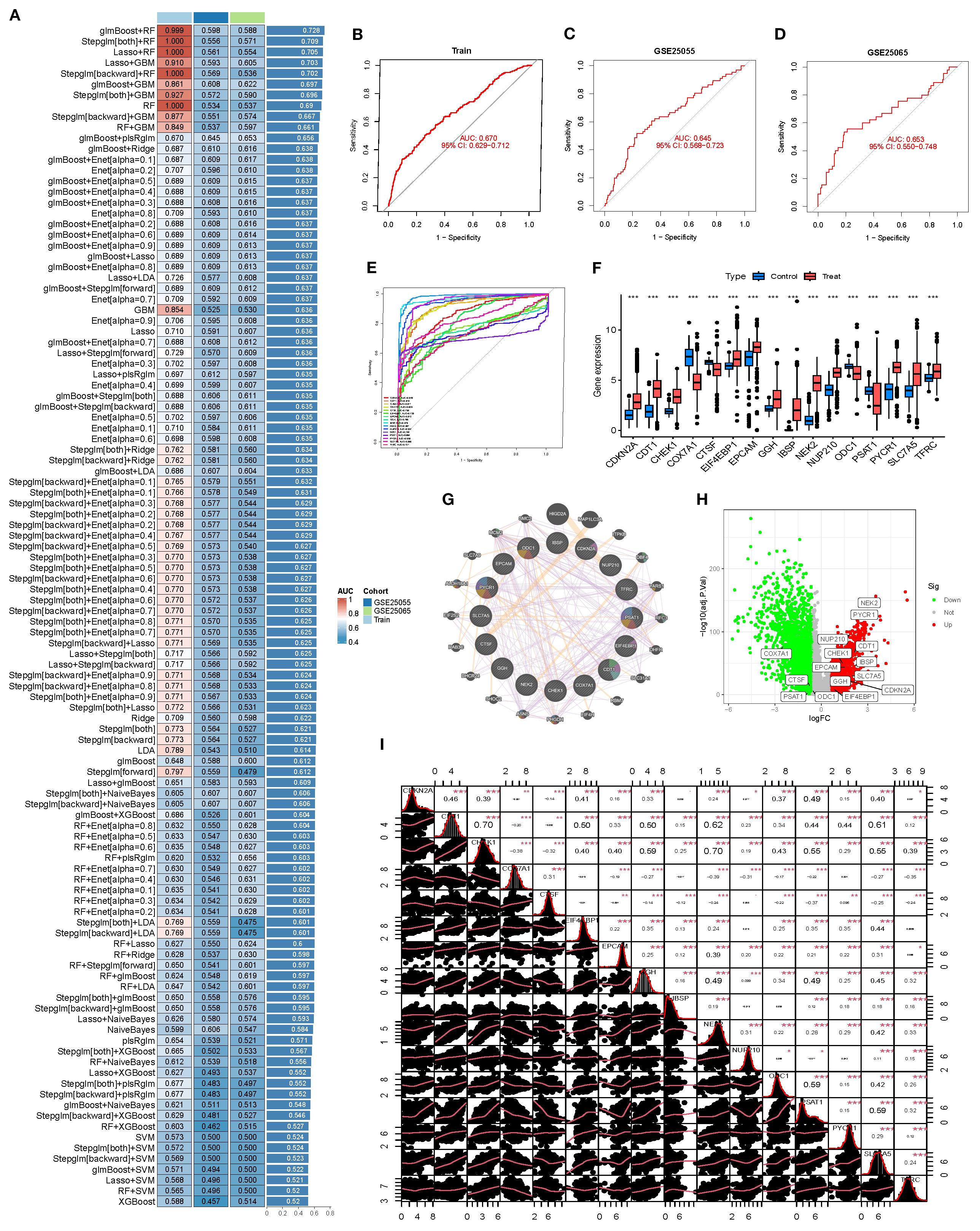 Figure 3. Machine learning–based feature gene model construction and validation. (A) Heatmap comparing the predictive performance (AUC) of >100 machine learning combinations across the training set (Train) and two validation sets (GSE25055, GSE25065). (B-D) ROC curves of the selected model in the training and validation sets, illustrating its classification ability. (E) Summary ROC curves of individual model genes. (F) Boxplots of gene expression in BRCA vs. normal. (G) Protein–protein interaction (PPI) network of model genes and 20 co-expressed/co-functional partners in the BRCA context. (H) Volcano plot showing differential expression of model genes between tumor and normal tissues. (I) Correlation matrix of model genes, visualizing overall co-expression patterns.
