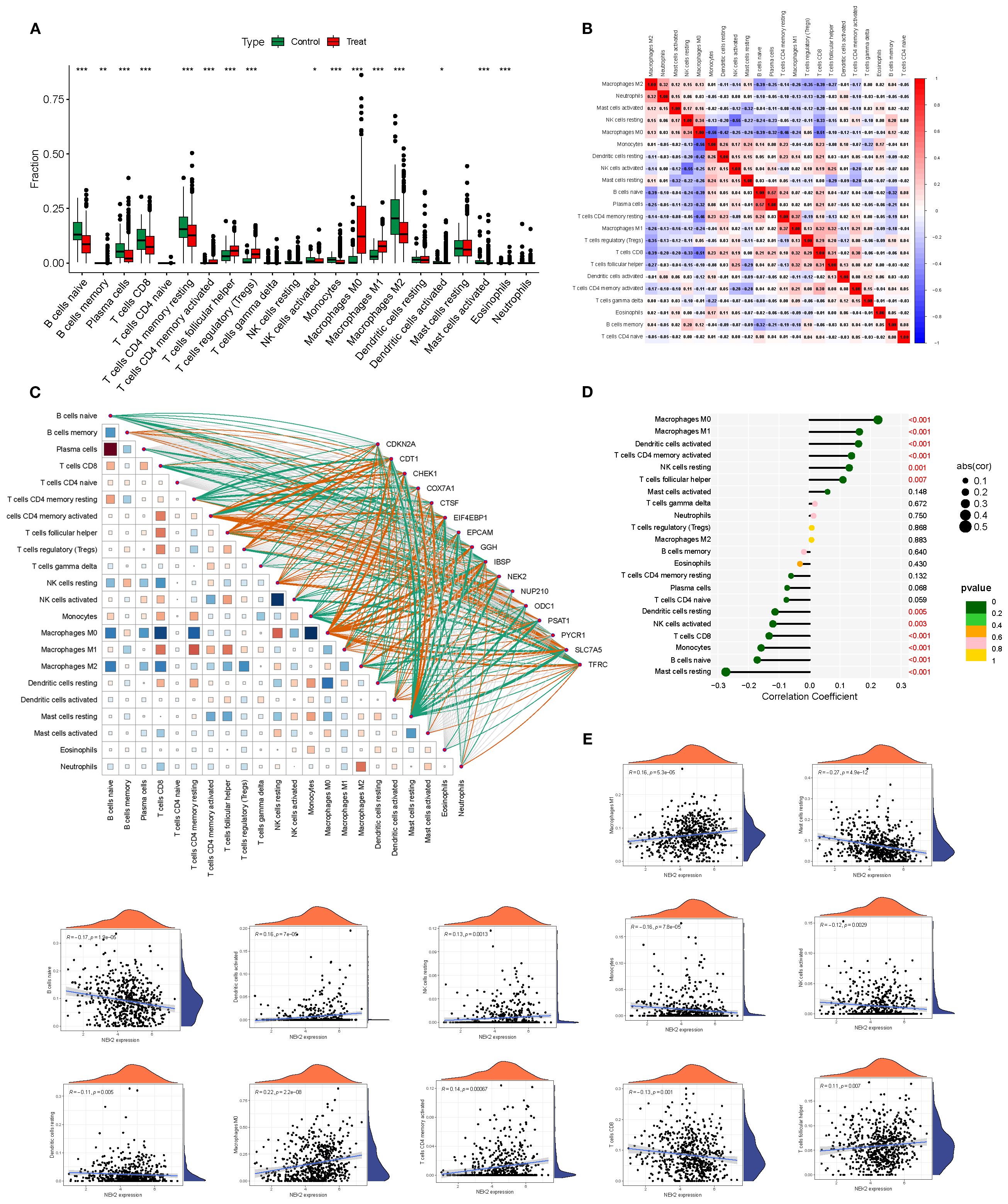 Figure 4. Immune microenvironment differences and gene–immune correlations in BRCA. (A, B) Differential immune cell infiltration between survival and deceased groups. (C) Heatmap showing correlations between 16 model genes and 22 immune cell subsets. (D, E) Significant associations between NEK2 expression and multiple immune cell types. *P<0.05, **P<0.01, ***P<0.001.