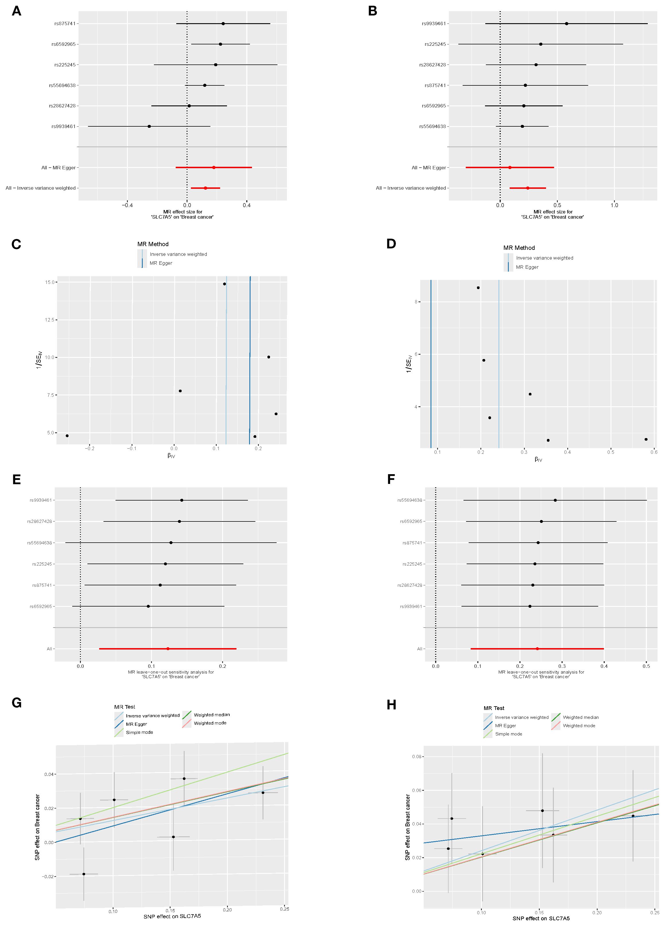Figure 5. Causal association between SLC7A5 and BRCA risk. (A, B) Forest plots of SNP-level and overall causal estimates (β, 95% CI) of SLC7A5 on BRCA risk using MR-Egger and inverse-variance weighted (IVW) methods. (C, D) Funnel plots evaluating directional pleiotropy and heterogeneity across SNPs. (E, F) Leave-one-out sensitivity plots assessing the influence of individual SNPs on causal estimates. (G, H) Scatter plots of SNP effects on SLC7A5 expression (exposure) and BRCA risk (outcome), with fitted slopes from five MR methods (IVW, MR-Egger, etc.).