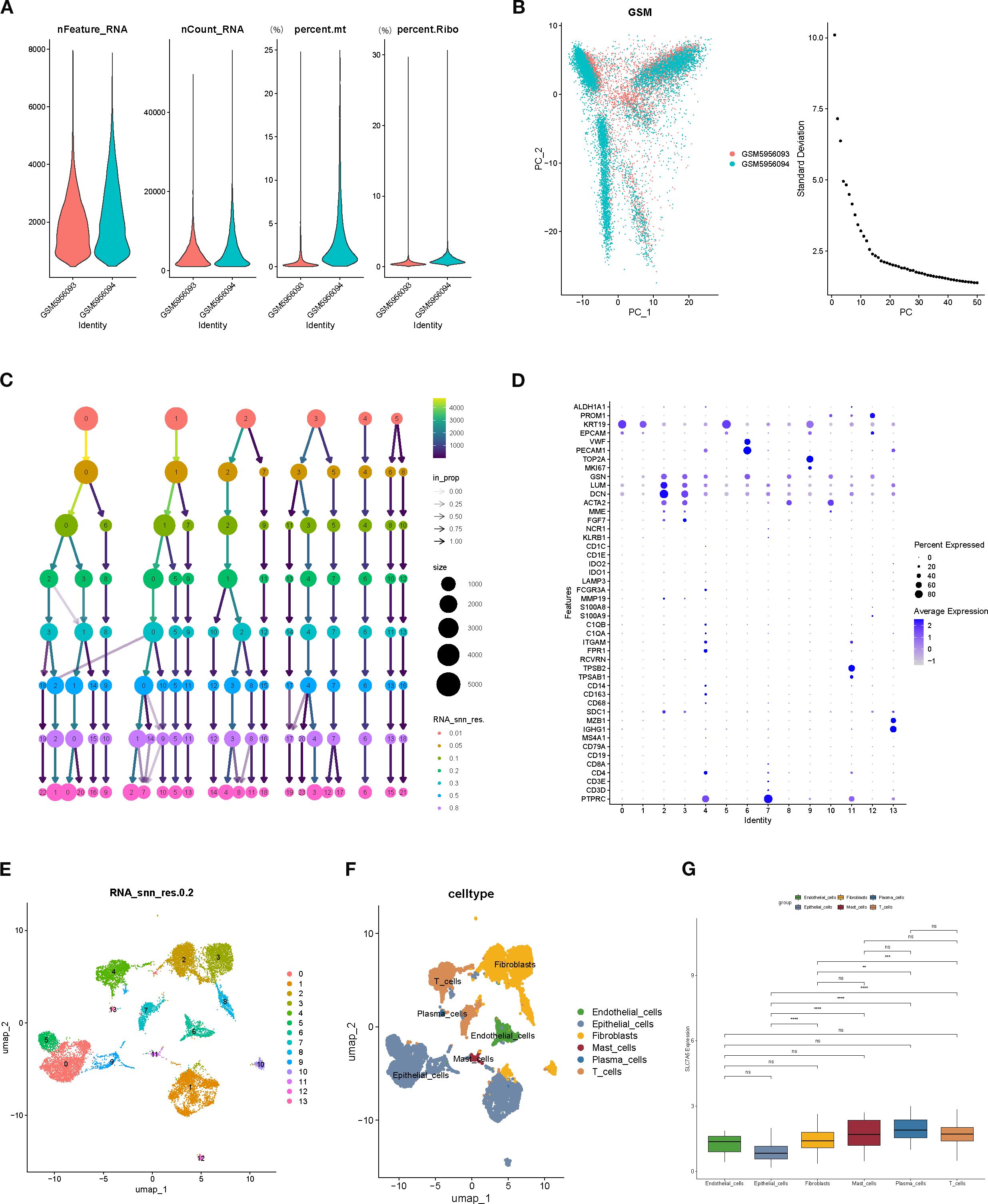 Figure 6. Single-cell RNA sequencing data quality control and cell type annotation. (A, B) Quality control metrics (nFeature_RNA, nCount_RNA, percent.mt, percent.Ribo). (C) Distribution of cell numbers, sequencing depth, and relative proportions across cell populations. (D) Marker Gene Bubble Chart. (E) Clustering results of cells based on the UMAP algorithm. (F) Expression of marker genes and cell type annotation, including fibroblasts, plasma cells, endothelial cells, epithelial cells, mast cells, and T cells. (G) SLC7A5 expression across different cell types, showing highly significant differences between epithelial cells and fibroblasts, plasma cells, mastcells, and T cells.
