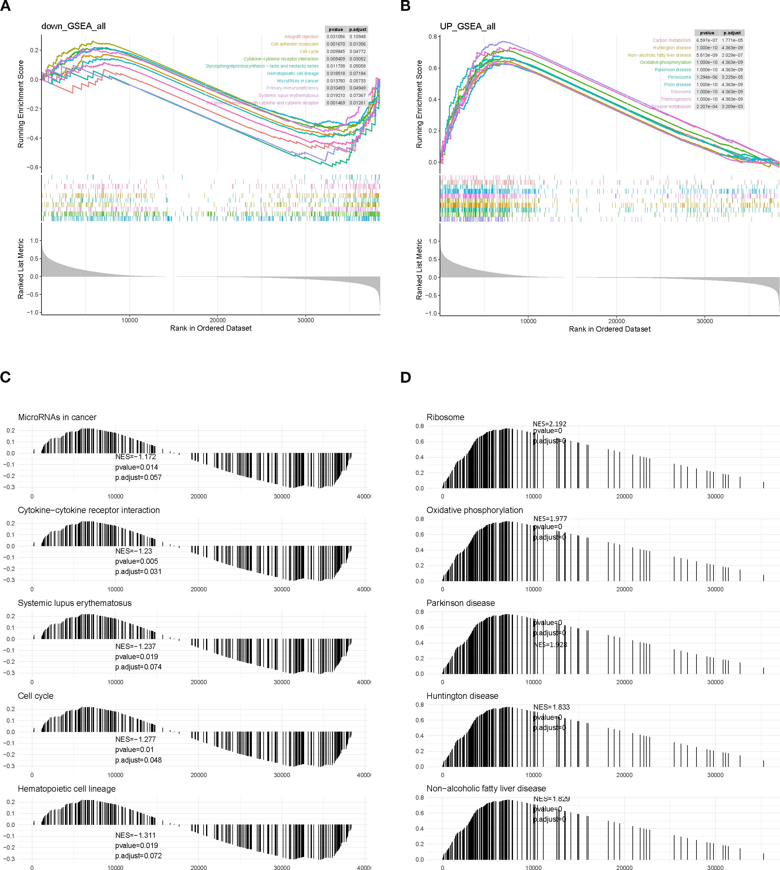Gene set enrichment analysis (GSEA) revealed that low-SLC7A5–expressing samples exhibited downregulation of pathways related to immune responses, cell adhesion, and proliferation, including allograft rejection, cell adhesion molecules, cell cycle, and cytokine–cytokine receptor interaction (Figures 7A, C). Conversely, high-SLC7A5–expressing samples showed upregulation of pathways associated with energy metabolism, protein synthesis, and neurodegenerative disease processes, including carbon metabolism, oxidative phosphorylation, and ribosome pathways (Figures 7B, D). These findings suggest that SLC7A5 may influence tumor progression by modulating immune responses and metabolic processes.