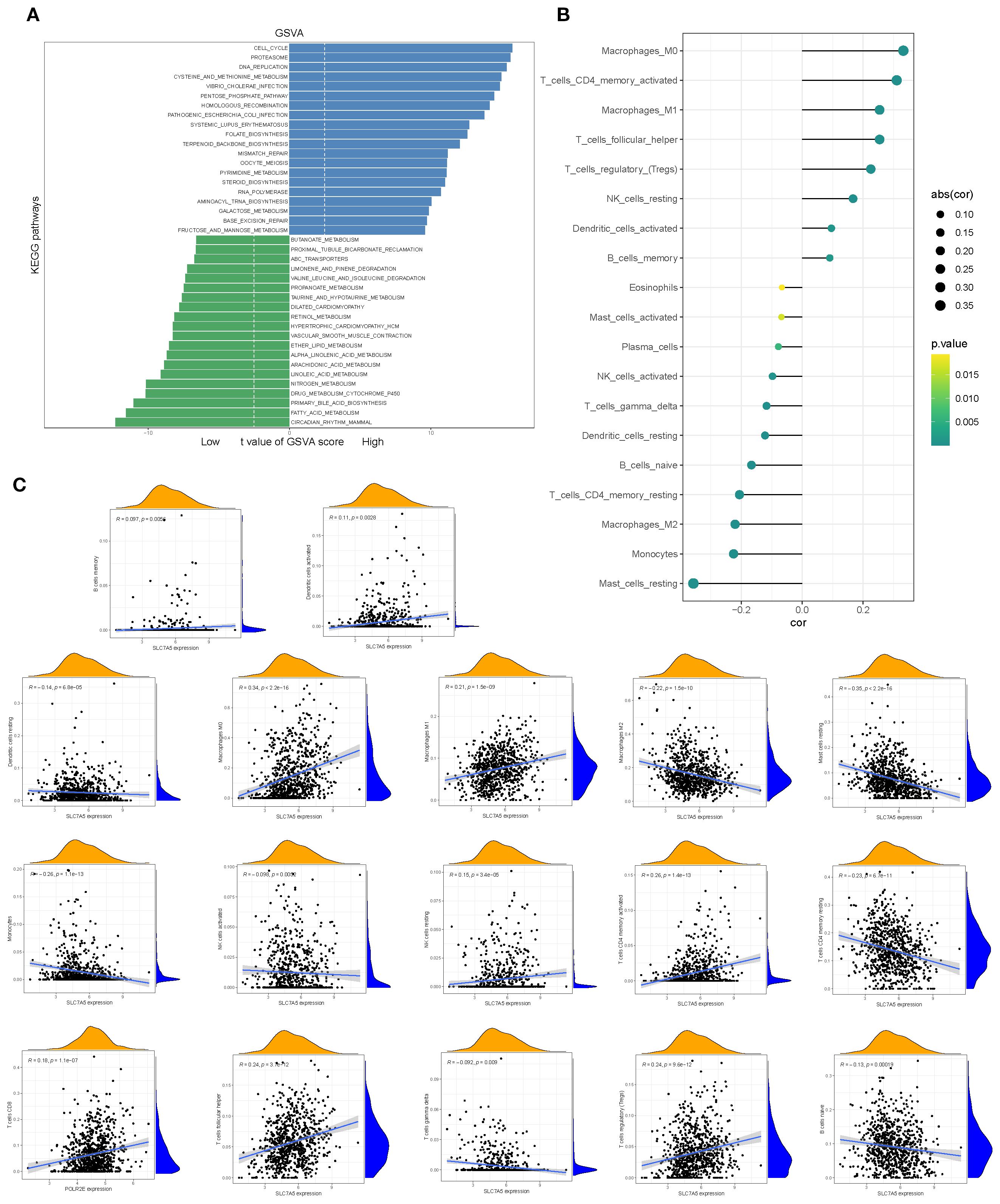Figure 8. Pathway alterations and immune associations of SLC7A5. (A) GSVA-based analysis showing pathways significantly enriched in high- vs. low-SLC7A5 groups. (B, C) Correlations between SLC7A5 expression and multiple immune cell infiltration levels.