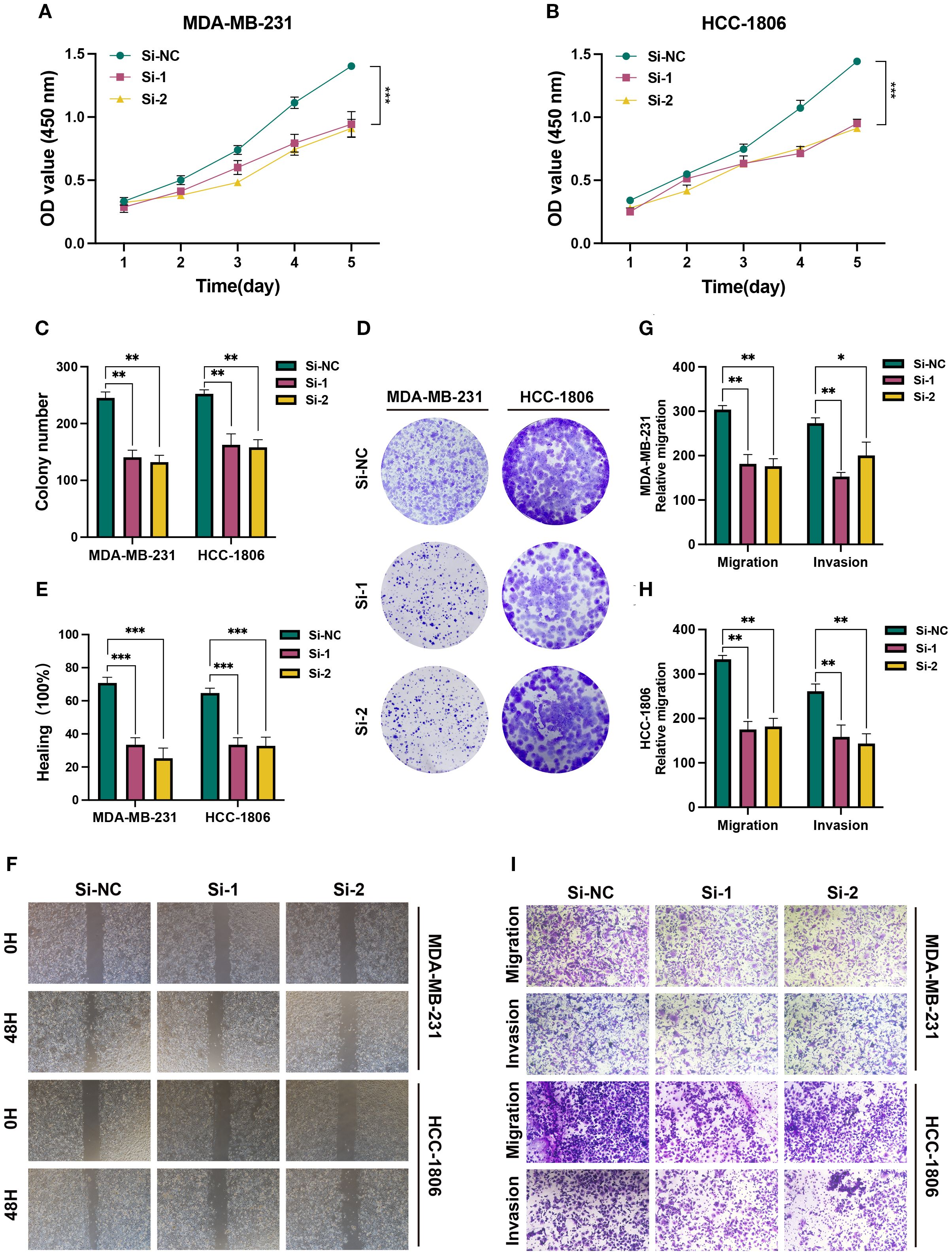 Figure 9. In vitro experiment after SLC7A5 knockdown. (A, B) CCK-8 showed that the proliferation activity of the cells that knockdown SLC7A5 was dramatically reduced. (C, D) After SLC7A5 knockdown, the cloning ability of MDA-MB-231 and HCC1806 cell lines decreased significantly. (E, F) Healing test. After SLC7A5 knockdown, the migration ability of MDA-MB-231 and HCC1806 cell lines decreased significantly. (G-I) Transwell assay. After SLC7A5 knockdown, the migration and invasion abilities of MDA-MB-231 and HCC1806 cell lines were significantly decreased. *P<0.05, **P< 0.01, ***P<0.001.