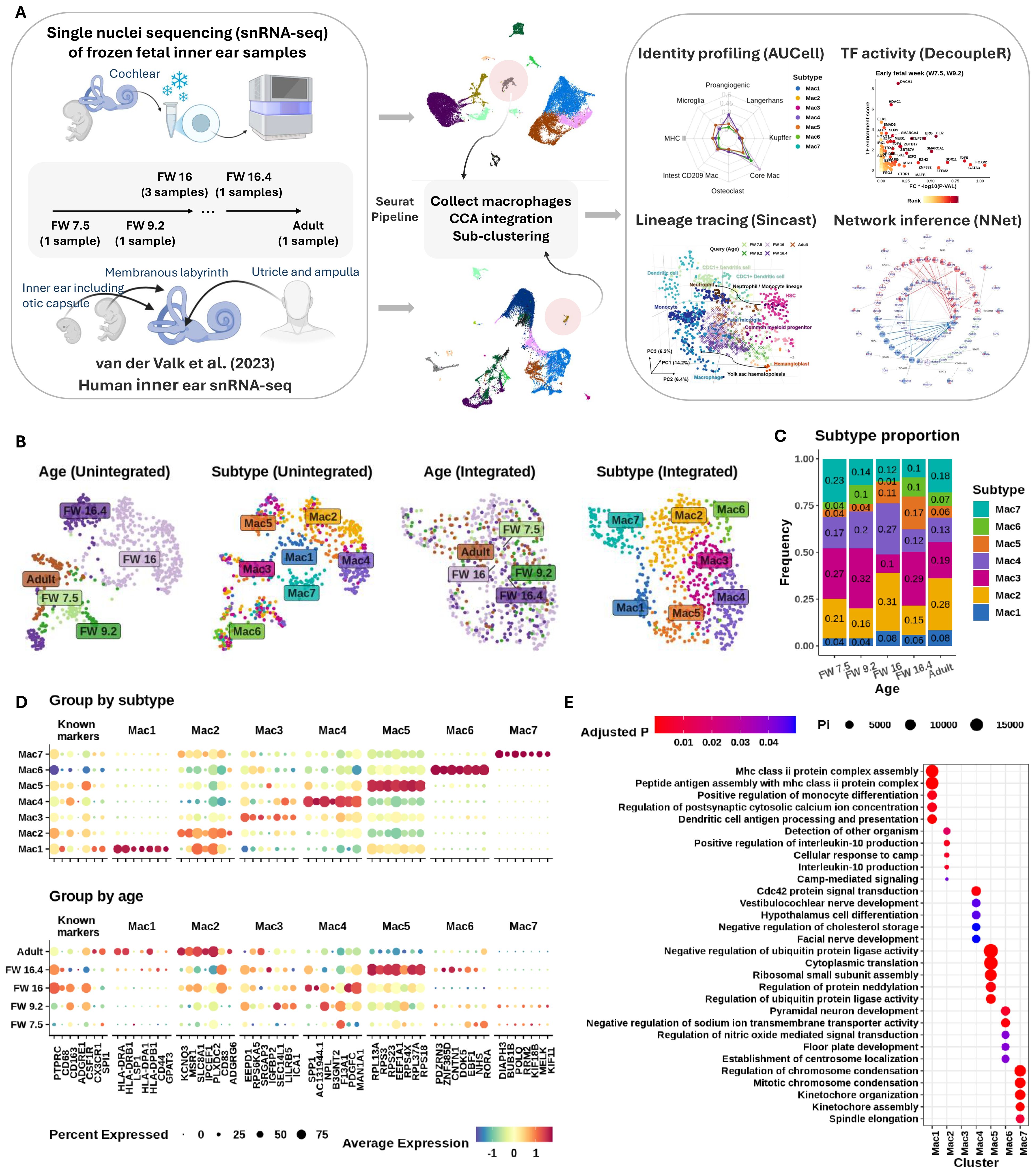 Figure 1. Seven fetal macrophage subtypes found in the developing inner ear. (A) Schematic of (L–R) tissue sample, integration, and analysis workflows used in this study. (B) Uniform manifold approximation and projection (UMAP) plots showing grouping of cells before (L) and after (R) Seurat integration. Macrophage subtypes were identified using Leiden clustering. (C) Stacked bar plot showing proportions (y-axis) of each subtype across developmental age (x-axis). (D) Expression of common macrophage markers and top-ranked discriminating genes (first seven genes) in each subtype. y-Axis shows categories of subtype (top) and age (bottom). Gene symbols shown on x-axis. Column headers indicate the subtypes that the markers represent. Expression shown on column-normalized z-score (red, highest expression; blue, lowest; yellow, mean expression value). The size of the dot indicates the percentage of the group expressing the gene of interest. (E) Gene set over-representation analysis of genes differentially expressed between macrophage subtypes. Subtypes shown on x-axis and gene ontology pathway terms on y-axis. Enrichment shown as circle size (relative proportion) and color (adjusted p-value).