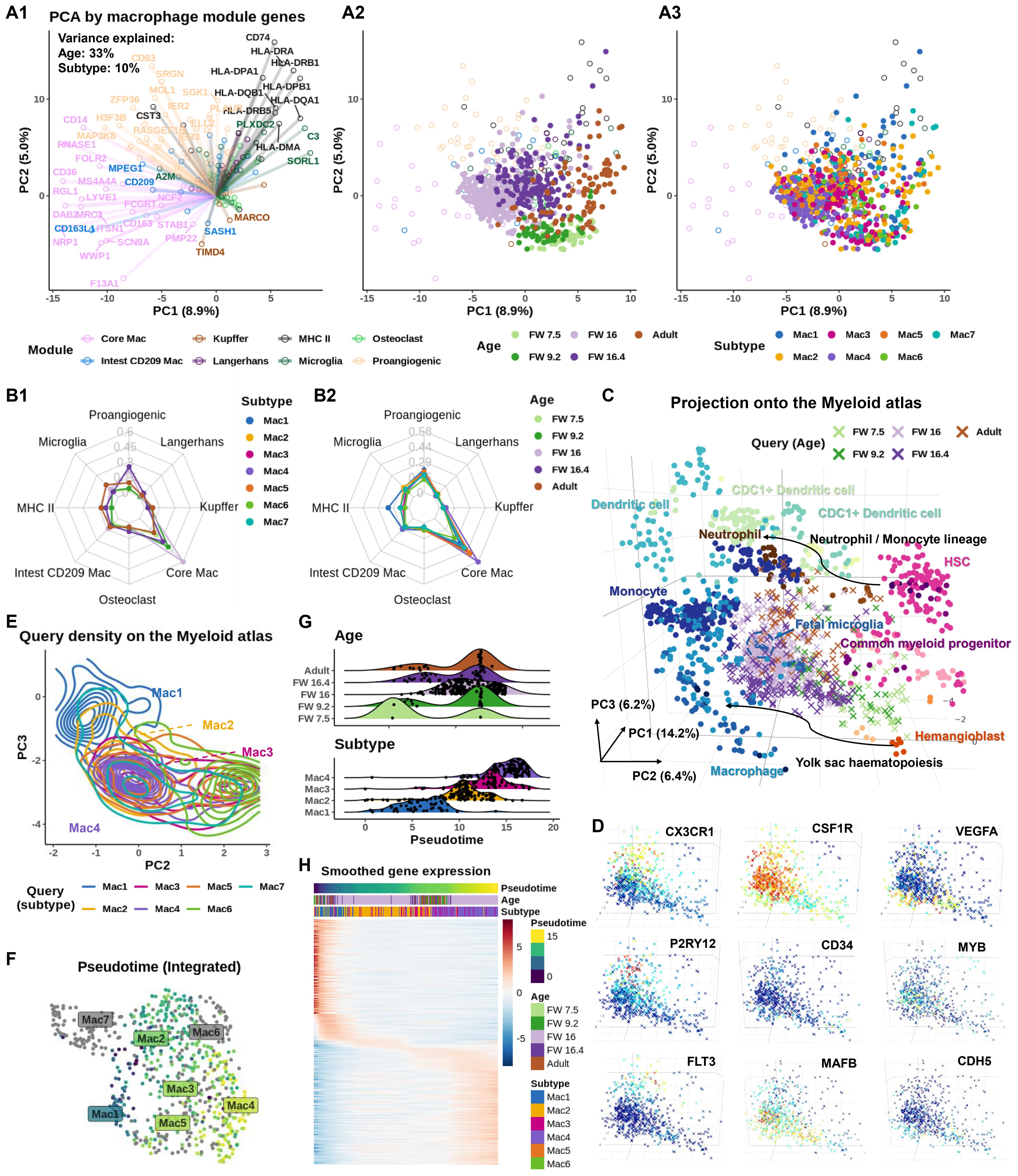 Figure 2. Age-dependent recruitment of macrophages to the inner ear shows defined subtypes present at distinct times. (A) Biplot showing principal component analysis (PCA) based on macrophage module genes (46). (A1) Circles represent gene loadings, colored by tissue module. PC scores of inner ear macrophages (IEMs) denoted as dots, colored by (A2) donor age and (A3) subtypes. (B) Radar graphs showing AUCell score of macrophage module genes at different (B1) developmental stages and (B2) different IEM subtypes in the inner ear (C) Projection of IEM subtypes to the Stemformatics.org myeloid atlas. Atlas samples denoted as circles and projected inner ear data as crosses. Inner ear samples colored by age. (D) Projected IEMs colored by the expression of CX3CR1 (adult), CSF1R (all), VEGFA [fetal weeks (FWs) 7.5, 9.2, and 16.4], P2RY12 (FW 16 and adult), CD34 (FWs 7.5 and 9.2), MYB and FLT3 (FW 16 and adult), and MAFB and CDH5 (FWs 7.5, 9.2, and 16.4). (E) Contour map of projected IEMs colored by subtypes demonstrates a continuum between Mac 1, 2, 3, and 4. (F) Uniform manifold approximation and projection (UMAP) plot, colored by pseudotime inferred using b mn, shot with Mac 1 selected as the root, highlights a trajectory of projected IEMs. Mac 5, 6, and 7 are excluded from the trajectory. (G) Pseudotime alignment of macrophages shows subtype (bottom plot), rather than age (top plot), as the strongest predictor of pseudotime on the Stemformatics atlas. (H) A heatmap of the top 500 genes correlated with pseudotime, clustered along the pseudotime axis, showing transition from Mac 1 to Mac 4.