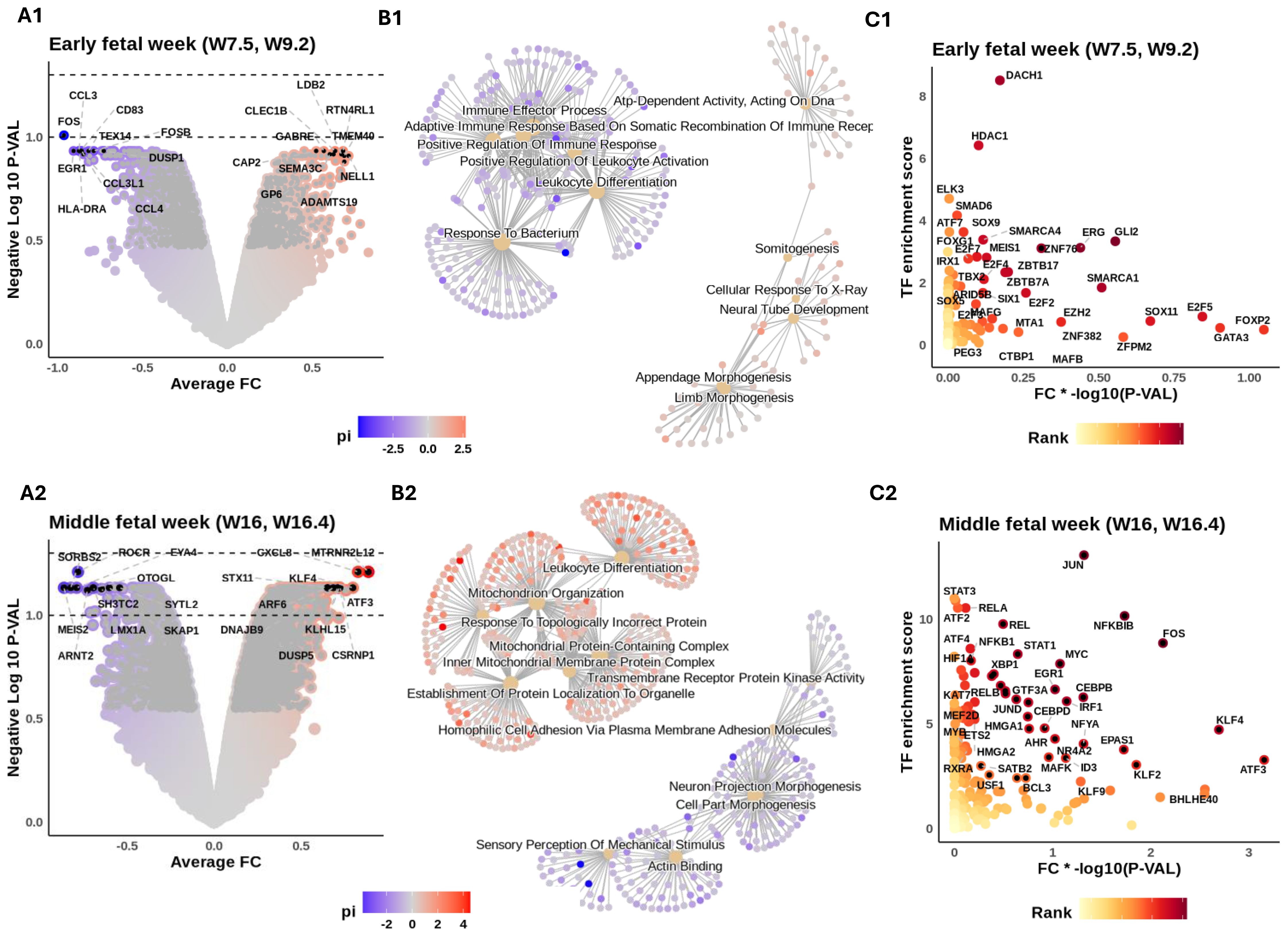 Having investigated the influence of developmental age on macrophage subtypes, we next examined genes that were significantly up- or downregulated in early FWs 7.5 and 9.2 compared to later developmental stages (middle FWs 16 and 16.4 and adult; Figure 3A1). A summary of results is presented in Table 3.