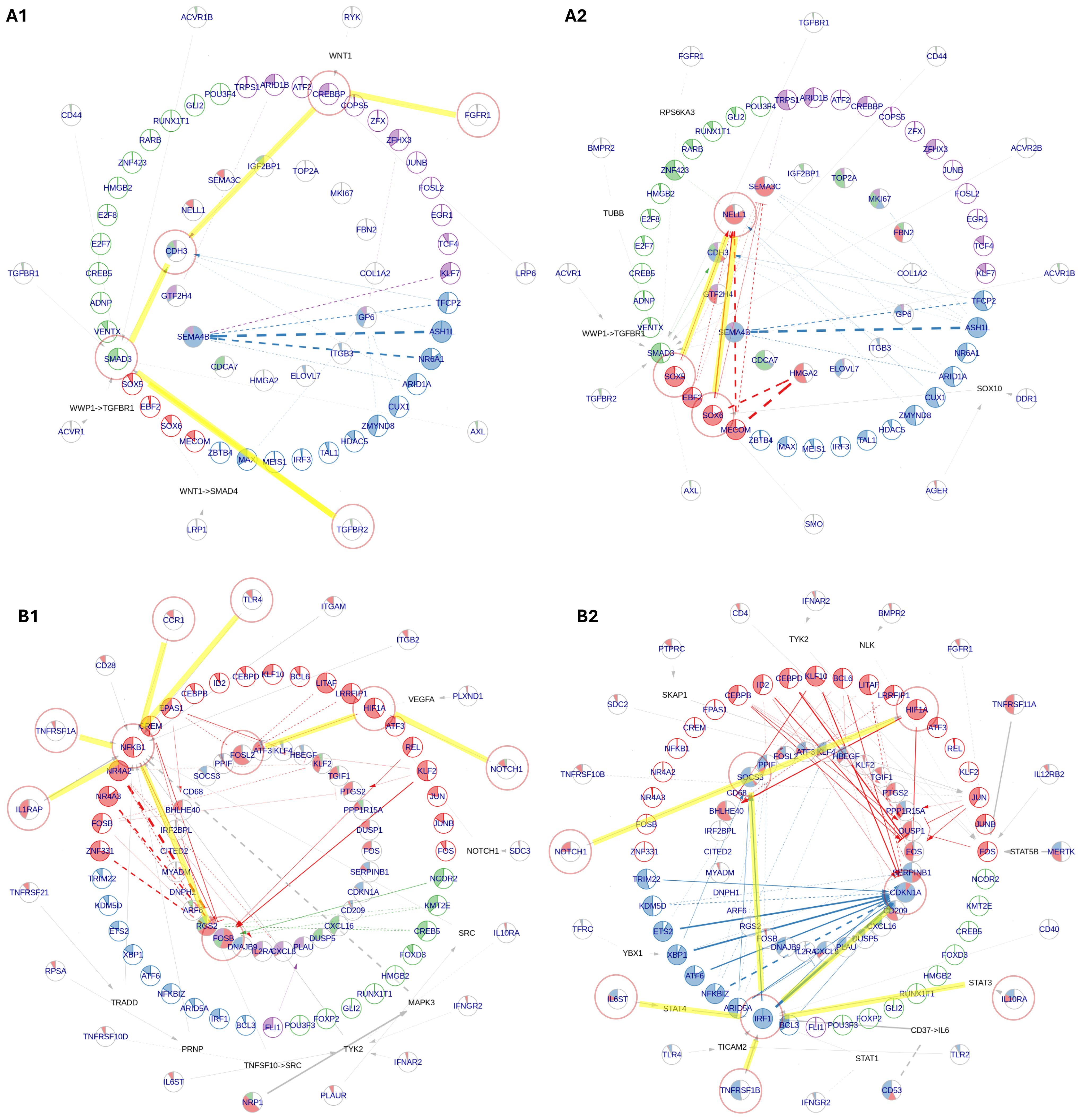 Figure 4. NeighbourNet inference of gene regulatory networks (GRNs) associated with the top 50 upregulated genes by early and middle fetal week (FW) inner ear macrophages (IEMs). The age markers are derived from differential gene expression analysis in Figure 3A. (A) GRNs for early FW markers, constructed primarily by IEMs at (A1) FW 7.5 and (A2) FW 9.2. (B) GRNs for middle FW markers, constructed primarily by (B1) Mac 2 and (B2) Mac 4 clusters. The macrophages used for GRN inference were automatically selected by the NeighbourNet algorithm as those exhibiting the most representative regulatory patterns. In each network, the innermost layer contains age markers, surrounded by their highly co-expressed transcription factors (TFs). Receptors are placed in the outermost layer, each connected to a TF predicted to mediate its regulatory influence. When the receptor–TF link is indirect, an additional layer displays the shortest inferred signaling path. Arrowheads indicate activation, bar-heads indicate repression, and dashed lines denote links with significant co-expression but not supported by prior knowledge or regulatory evidence. The color of each TF indicates its cluster, representing groups of TFs with similar co-expression patterns. The color of each target reflects the proportion of regulatory edges it receives from different TF clusters. The filling proportion of each pie represents the gene’s activation status: the more filled the pie, the higher the activity.