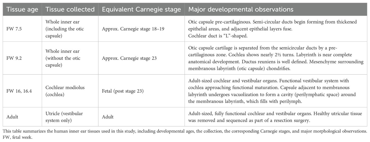 Table 1 summarizes the human inner ear tissues used in this study, including their developmental ages, collection sites, corresponding Carnegie stages, and major developmental observations. Samples were obtained between 2022 and 2023 from donors undergoing elective termination of pregnancy, following provision of written informed consent. Donors reported no known genetic or medical conditions. Exclusion criteria included fetal anomalies, abnormal growth (large or small for gestational age), exposure to chemical substances, and any self-reported donor medical conditions. Three samples, gestational week (GW) 18, were used in this study: a male and a female GW 18, and a male GW 18.4. Sex was determined using PCR. Fetal gestational age was assigned using ultrasound (ACUSON Juniper Juniper™ Ultrasound System; Siemens Healthineers, Ottawa, Ontario) by measuring the femur length, biparietal diameter, and foot length and then confirmed using a growth table (100). These gestational ages have been converted into FWs to align with existing data used for comparison (3). As such, GW 18 was included as FW 16, and GW 18.4 was included as FW 16.4. The time between collecting and receiving the tissue in our laboratory was less than 4 h. Samples were collected and dissected in ice-cold Hanks’ Balanced Salt Solution (HBSS) (Wisent, Montreal, Quebec; #311-512-CL) with 1% 1 M HEPES (Wisent, Montreal, Quebec; #330–050 EL). Spiral ganglia tissues were dissected from the intact cartilaginous otic capsule, sensory epithelium, and modiolus. Two samples (female FW 16.0 and male FW 16.4) were treated for 10 min at 37 °C in 2 mg/mL thermolysin from Geobacillus stearothermophilus (Millipore-Sigma, Oakville, Ontario; #P1512) to decrease the amount of surrounding mesenchyme and then dissected in the dissection solution containing fetal bovine serum (Thermo Fisher Scientific, Toronto, Ontario; #12484028) to immediately reduce the enzymatic activity, followed by washing steps with HBSS supplemented with 1% HEPES. Samples were placed in 1.5-mL DNA LoBind tubes (Eppendorf®, Mississauga, Ontario; #022431081) and then flash-frozen and stored in liquid nitrogen.