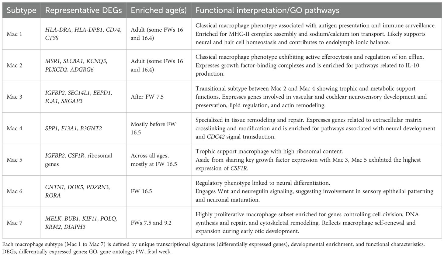 By contrast, Mac 3, 4, and 5 displayed broader associations with facial and vestibulocochlear nerve development (Figure 1E). For instance, they indicated a trophic phenotype through their relative expression of IGFBP2 (Mac 3 and 5) (32), PDGFC (Mac 4) (33), and CSF1R (Mac 5) (34). These growth factors and receptors are vital for both vascular and cochlear neurosensory development and preservation. Additionally, Mac 4 showed functional specialization in tissue remodeling, evidenced by the expression of secreted phosphoprotein 1 (SPP1) (35), transglutaminase F13A1 (36), and acetylglucosaminyltransferase B3GNT2 (37), which are genes involved in crosslinking and modifying matrix proteins.