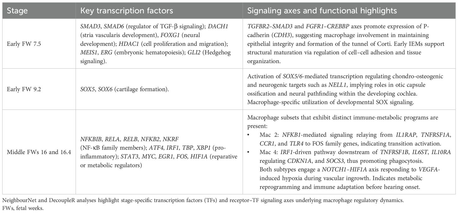 Table 3. Summary of key transcriptional regulators and signaling pathways identified in inner ear macrophages (IEMs) across developmental stages.