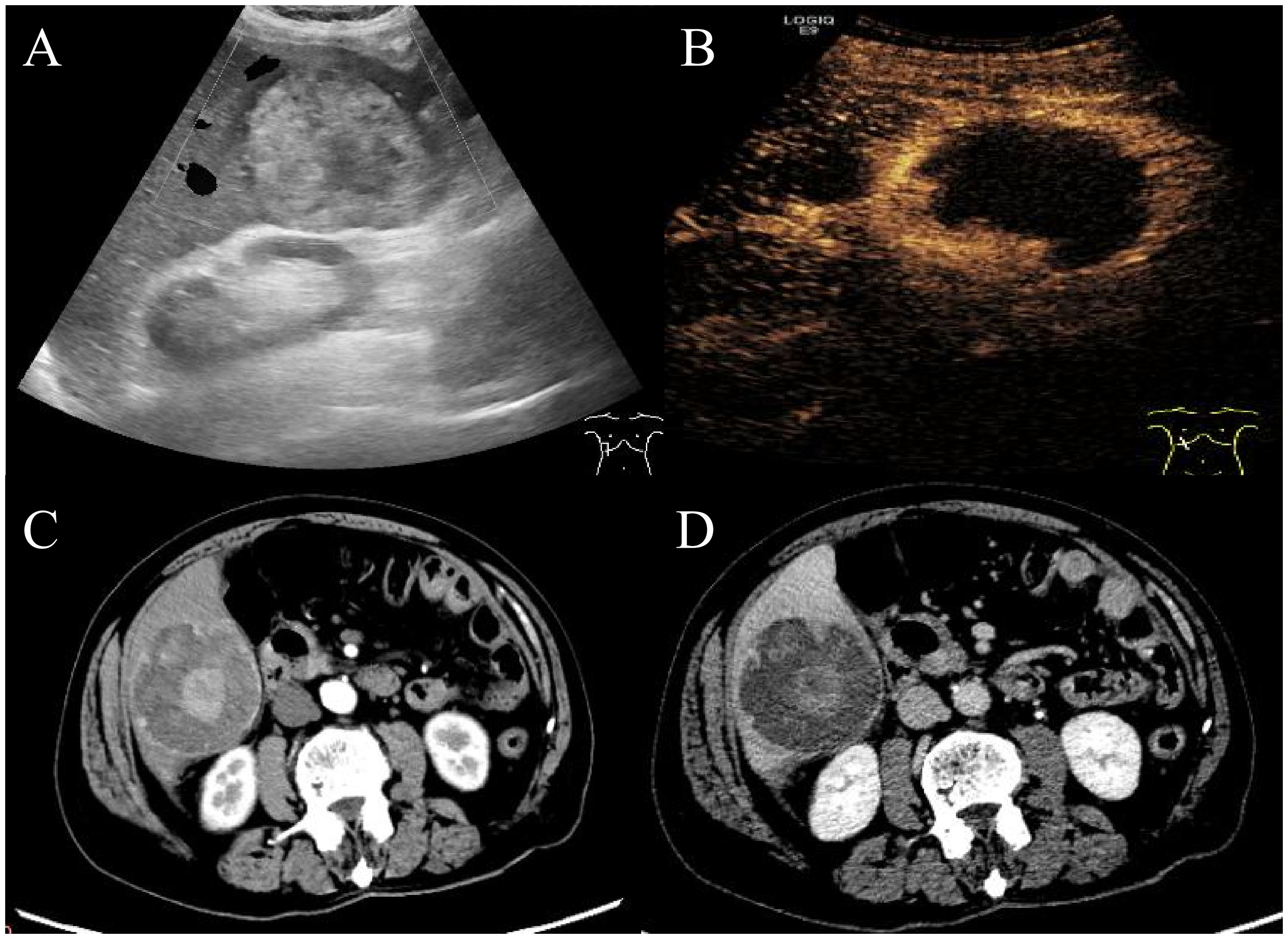Figure 1. Abdominal ultrasound and enhanced CT imaging of the manifestations of liver lesions. Abdominal ultrasound and contrast-enhanced ultrasound showed a well-defined hyperechoic lesion in the right posterior hepatic lobe (A, B). Contrast-enhanced CT revealed a hyperechoic tumor in hepatic segment VI with peripheral hyperdensity and central hypodensity with heterogeneous hyperdensity during the portal phase (C, D).