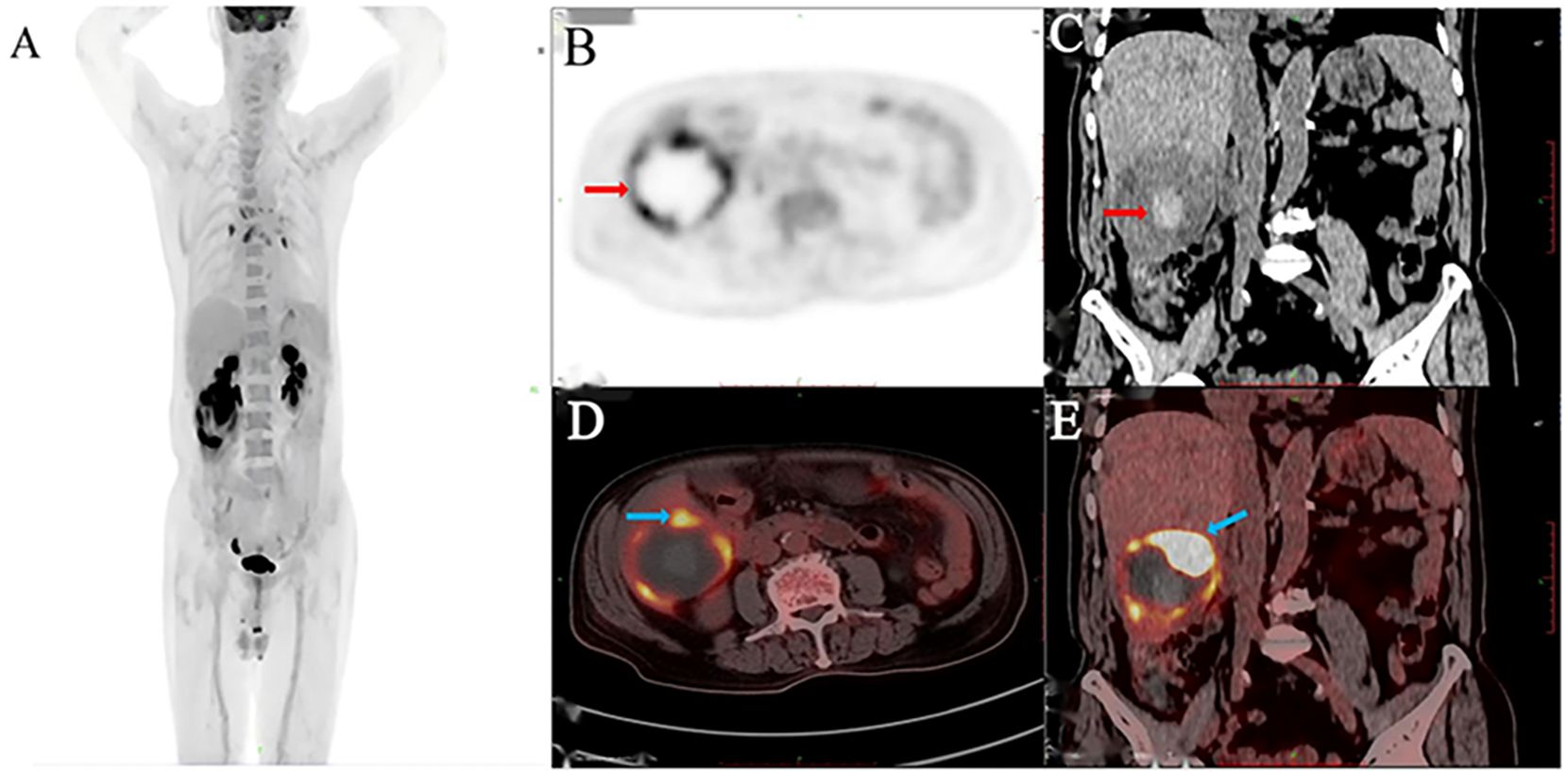 An 83-year-old man presented with acute upper abdominal pain and distension lasting one day, with no history of trauma. He had a 20-year history of chronic hepatitis B virus(HBV) infection managed with daily entecavir (0.5 mg). He previously underwent surgical treatment with stent implantation for coronary atherosclerotic heart disease. Physical examination demonstrated right upper quadrant tenderness without peritoneal signs, Murphy’s sign, venous collaterals, or ascites. Laboratory findings revealed mild anemia (hemoglobin 94 g/L), with reduced red blood cell count (3.44 × 10¹²/L), hematocrit (31%), and mean corpuscular hemoglobin concentration (302 g/L). The ultrasensitive C-reactive protein level was markedly elevated at 100.16 mg/L. Liver function tests showed modestly increased gamma-glutamyl transferase and alkaline phosphatase (146 U/L each), while albumin measured 32.5 g/L with normal aminotransferase levels. Coagulation studies indicated a prothrombin time of 14.1 seconds (INR 1.32). Serology confirmed hepatitis B surface antigen positivity with undetectable viral DNA (<20 IU/mL). The tumor marker AFP was elevated (853 ng/ml), while other markers such as CA99, CA125, CEA and PIVKA-II were unremarkable. Abdominal ultrasound identified a well-circumscribed, mildly hyperechoic tumor in hepatic segment VI displaying heterogeneous echotexture (Figure 1A). Contrast-enhanced ultrasound revealed a well-defined hyperechoic lesion in the right posterior hepatic lobe, which strongly suggest hepatic malignancy (Figure 1B). Contrast-enhanced CT suggested a 6.7 × 6.8 × 6.5 cm mass in the same segment, showing peripheral hyperdensity and central hypodensity with heterogeneous enhancement during the portal phase (Figures 1C, D). The maximum intensity projection (MIP) image detected multiple pulmonary nodules and a lesion at the gastric fundus. Bilateral adrenal glands and several bone marrow sites exhibited mildly increased 18F-FDG uptake, with maximum SUVs of 1.1, 3.2, 2.4, and 3.2. These findings suggested benign rather than metastatic involvement (Figure 2A). 18F-fluorodeoxyglucose-positron emission tomography (18F-FDG-PET)/CT showed a heterogeneous mass in the right hepatic lobe (Figure 2B) that displaced the hepatic capsule outward and displayed intense metabolic activity (Figure 2C), with markedly elevated 18F-FDG uptake and a maximum standardized uptake value (SUV) of 21.4 (Figures 2D, E).