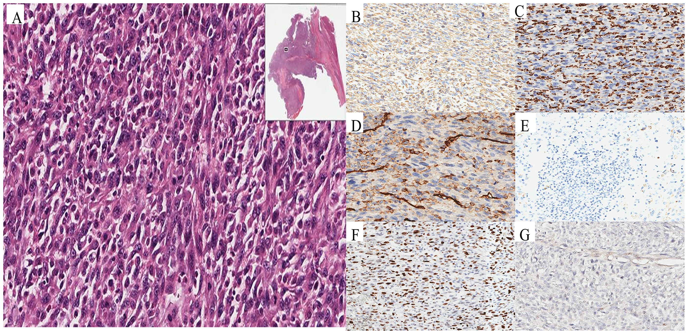 Figure 3. Pathological and immunohistochemical characteristics of UPSL. Histopathology revealed malignant characteristics, including tumor necrosis, spindle and epithelioid cell morphology, and elevated mitotic activity (A). Immunohistochemical staining showed diffuse strong vimentin expression (B), CD68 (C), CD31 (D) and SMA positivity (E), Ki-67 proliferation (F), and weak PD-L1 reactivity (G).