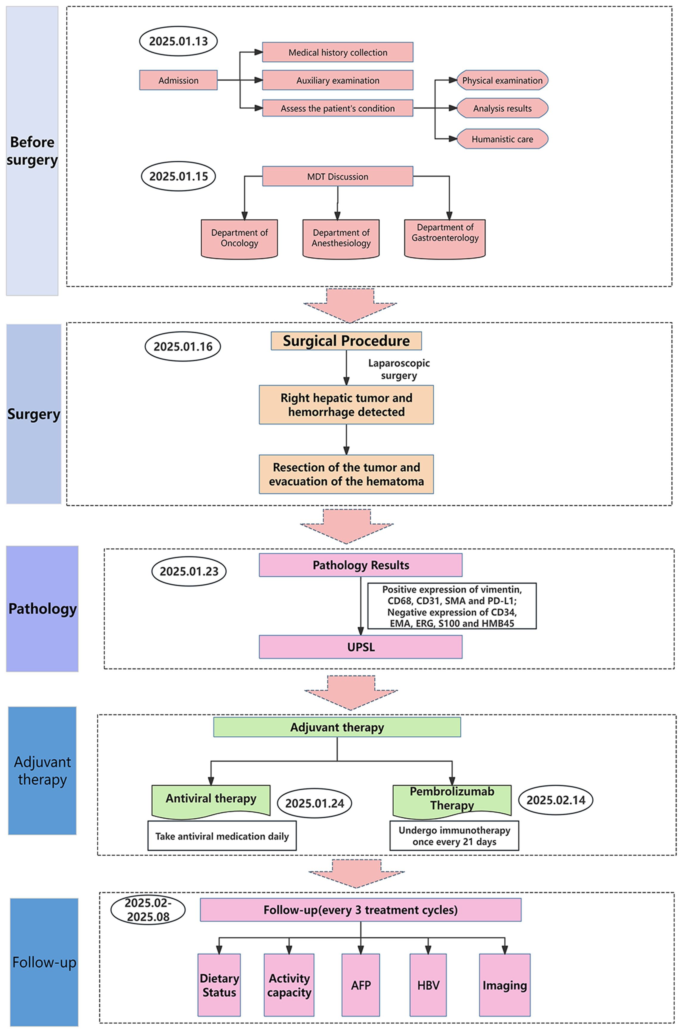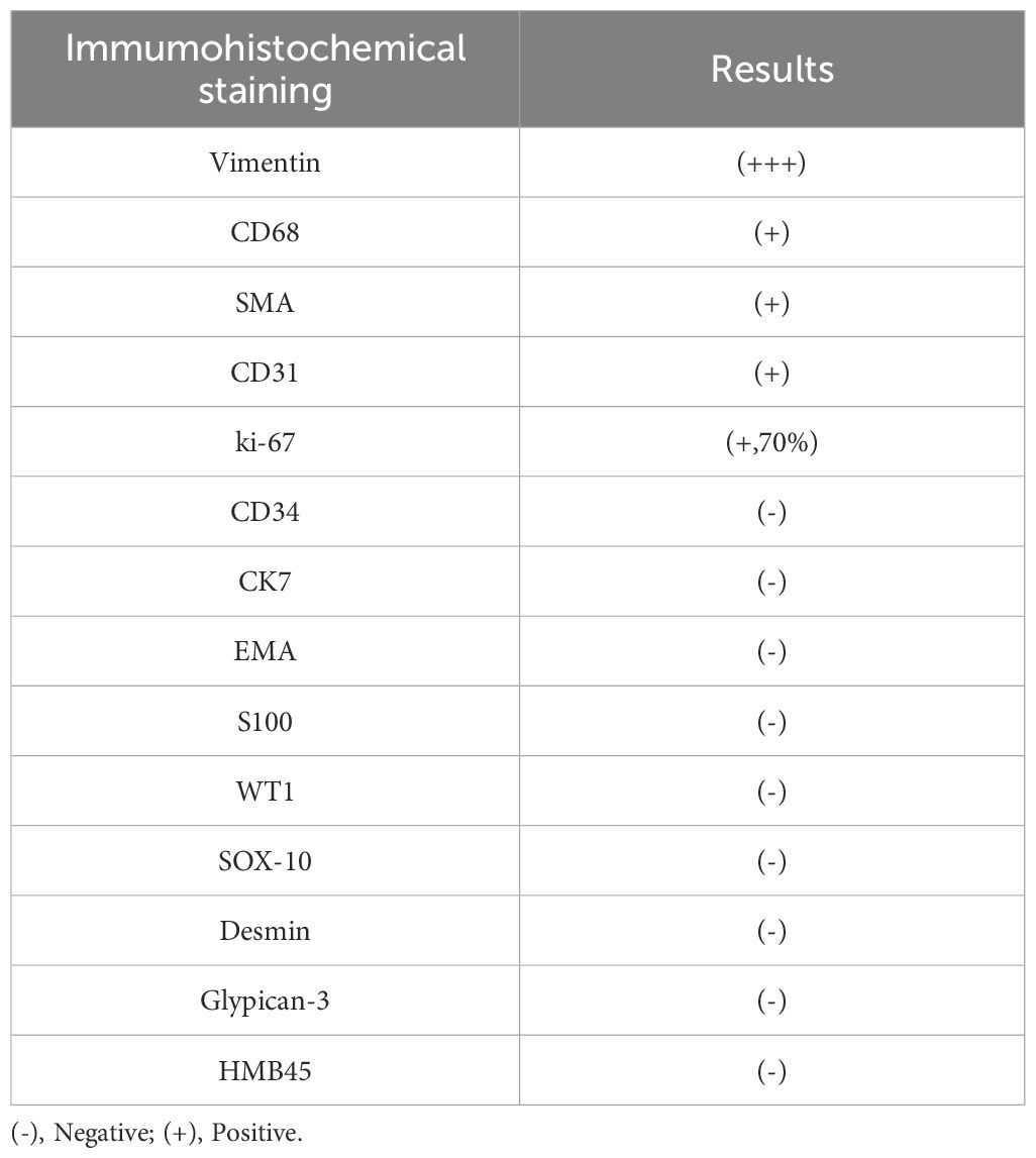Following multidisciplinary team evaluation, the liver lesion was diagnosed as malignant, with hepatocellular carcinoma (HCC) considered the probable diagnosis. The patient subsequently underwent right hepatic tumor resection. Intraoperative exploration revealed a ruptured hemorrhagic tumor firmly adherent to the right abdominal wall and transverse colon, with an organized hematoma in the right subphrenic space. Consequently, the surgical procedure included both tumor resection and evacuation of the rupture-induced hematoma. Notably, histopathological analysis confirmed malignant features, including tumor cell necrosis, spindle and epithelioid morphology, and increased mitotic activity (Figure 3A). Immunohistochemistry(IHC) results (Table 1) demonstrated diffuse strong vimentin expression (Figure 3B), weak cytoplasmic CD68 (Figure 3C), focal CD31 (Figure 3D) and SMA positivity (Figure 3E), ki-67 proliferation index of 70% (Figure 3F), and weak programmed death ligand 1 (PD-L1) reactivity (Figure 3G). Remarkedly, IHC scoring indicates the percentage of PD-L1-positive tumor cells demonstrating significant membrane staining. If more than 1% of tumor cells exhibit membrane staining, the tumor is considered PD-L1-positive.Meanwhile, the tumor tested negative for CD34, EMA, ERG, S100, HMB45. Finally, these collective findings established a definitive diagnosis of spontaneously ruptured UPSL rather than HCC. Furthermore, the molecular test results indicated tumor suppressor p53(TP53) gene mutations and mutations in the promoter region of the telomerase reverse transcriptase (TERT) gene, but no mutations in the exons of the C-KIT and PDGFRA genes were observed. His clinical symptoms and laboratory markers improved significantly, enabling discharge while continuing entecavir therapy. Postoperatively, the patient refused to undergo chemotherapy for personal reasons and insisted on receiving immunotherapy instead. Following eight cycles of pembrolizumab (200 mg every three weeks) administered based on PD-L1 positive status, the patient has maintained clinical stability without detectable treatment-related adverse effects. Figure 4 presents the patient’s diagnostic and treatment flowchart, and Supplementary Figure 5 depicts the corresponding changes in AFP levels over the treatment period.