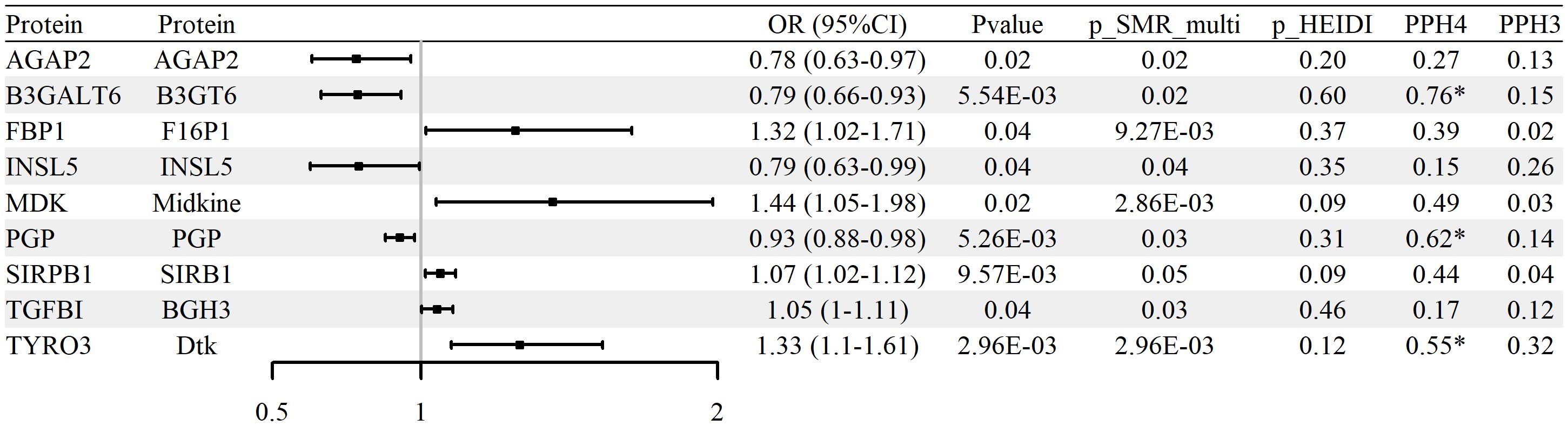 To evaluate whether protein abundance of glycolysis-related genes is associated with RA, SMR analysis was conducted using blood-derived pQTL data and FinnGen R12 GWAS summary statistics. A total of nine proteins, including AGAP2, B3GALT6, FBP1, INSL5, MDK, PGP, SIRPB1, TGFBI, and TYRO3, were identified as significantly associated with RA (p_SMR < 0.05, p_SMR_multi < 0.05, and p_HEIDI > 0.05). Full results are reported in Supplementary Table S8. Among them, five proteins (TGFBI, SIRPB1, FBP1, TYRO3, and MDK) showed positive associations with RA risk, while four (AGAP2, B3GALT6, INSL5, and PGP) were negatively associated.
