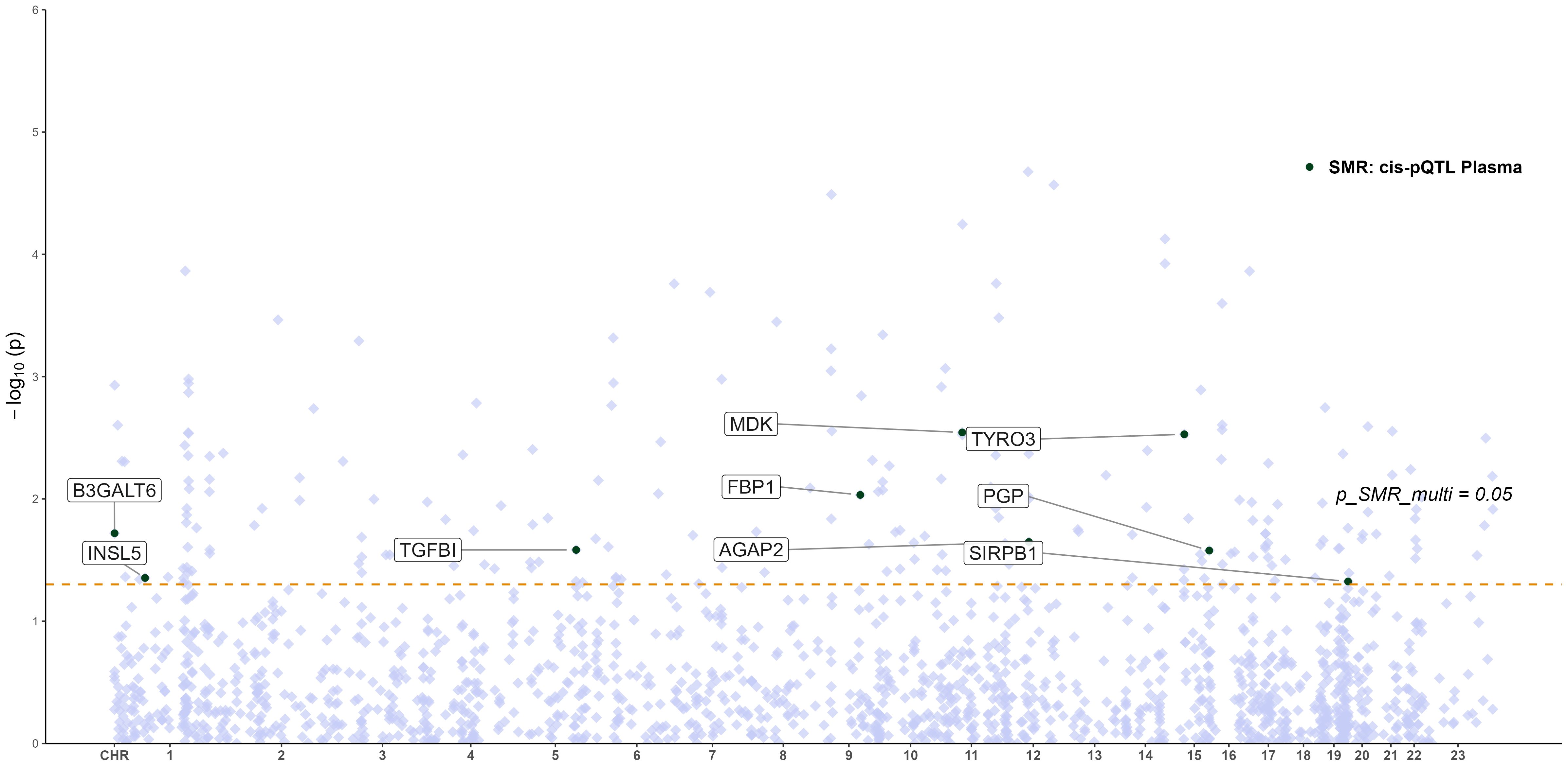 Figure 5. Manhattan plot of pQTL–GWAS SMR results for RA (blood pQTL; FinnGen R12 RA GWAS). Proteins meeting the SMR multi-test threshold are labeled.