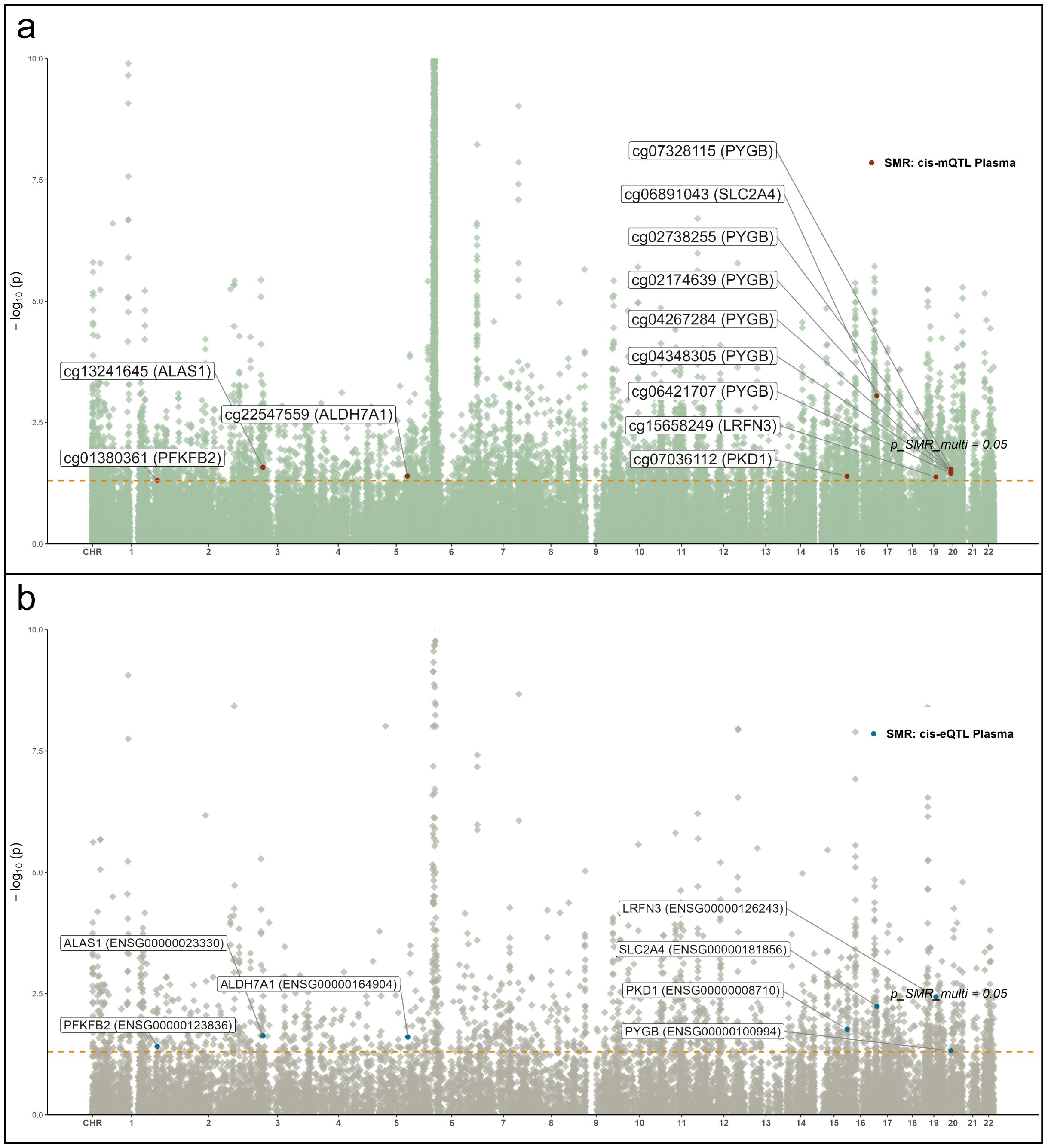 Figure 6. Manhattan plots of QTL–GWAS SMR results for RA (FinnGen R12 RA GWAS). (a) whole-blood mQTL; (b) blood cis-eQTL. Key loci (e.g., PKD1 and SLC2A4) are labeled.