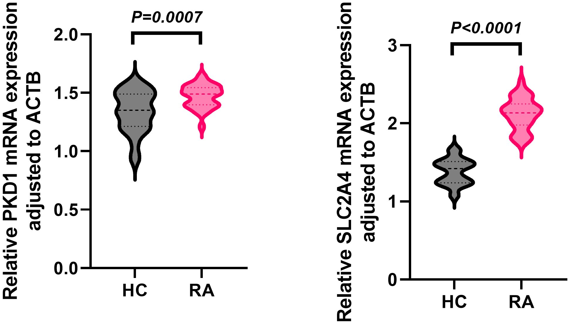 In the independent whole-blood validation cohort, qPCR analysis demonstrated that both PKD1 and SLC2A4 mRNA levels were significantly elevated in RA patients compared with healthy controls (HC) (Figure 9). Relative expression was quantified as 2−ΔCt values normalized to ACTB (β-actin). For PKD1, the mean relative expression was 1.47 ± 0.10 in RA compared with 1.34 ± 0.18 in HC (P = 0.0007). For SLC2A4, the mean relative expression was 2.12 ± 0.20 in RA compared with 1.38 ± 0.16 in HC (P < 0.0001).