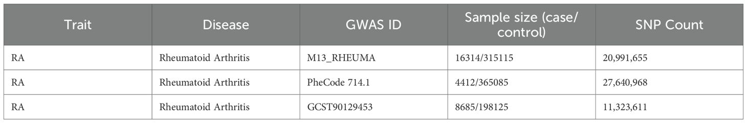 Three independent RA genome-wide association study (GWAS) datasets were used. The primary discovery cohort was obtained from the FinnGen consortium (Release R12, GWAS ID: M13_RHEUMA), including 16,314 RA cases and 315,115 controls of European ancestry. For validation, we used two independent RA cohorts: (1) the UK Biobank dataset from PheWeb (GWAS ID: PheCode 714.1 (4,412 cases and 365,085 controls) and (2) the GWAS Catalog dataset GCST90129453 (8,685 cases and 198,125 controls) (Table 1). All datasets were publicly available and based on individuals of European descent.
