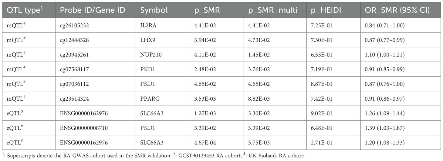 Table 2. SMR validation of glycolysis-related mQTL and eQTL signals for rheumatoid arthritis in independent RA GWAS cohorts.