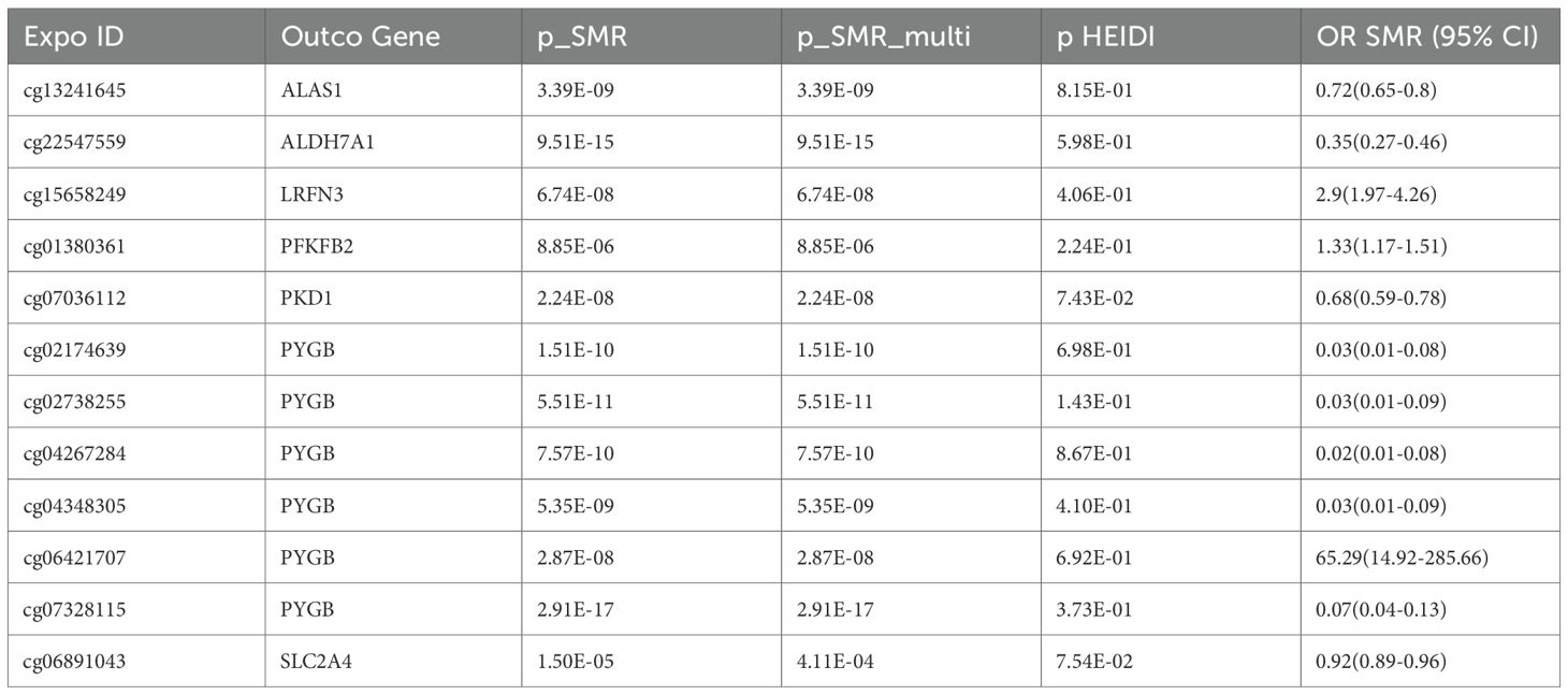 To assess whether CpG site methylation may regulate the expression of glycolysis-related genes implicated in RA, SMR analysis was performed using blood mQTLs as exposures and eQTLs as outcomes. The analysis focused on genes previously identified through independent mQTL–GWAS and eQTL–GWAS associations. Significant associations between methylation and expression were identified for seven genes—PKD1, SLC2A4, ALAS1, ALDH7A1, LRFN3, PFKFB2, and PYGB—covering 12 distinct CpG sites. SMR associations met the criteria of p_SMR < 0.05, p_SMR_multi < 0.05, and p_HEIDI > 0.05. The complete analysis results are presented in Supplementary Table S12, and selected findings are shown in Supplementary Table S5.