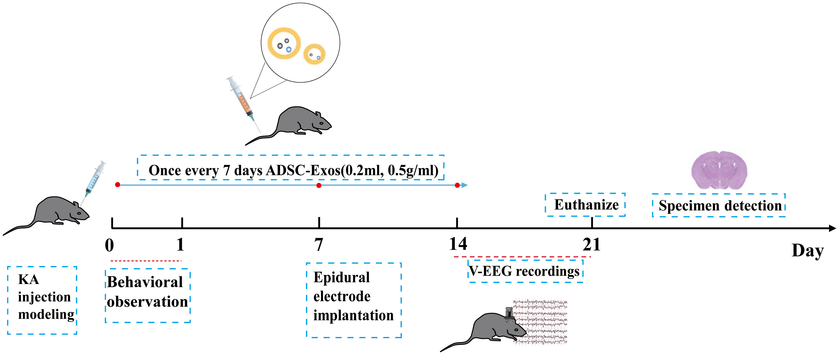 Figure 1. Schematic illustration of experimental setup and timeline. After KA-induced epilepsy modeling in mice, seizure severity was assessed via 24-hour behavioral observation. On day 7 post-modeling, epidural electrodes were implanted with a 7-day recovery period. Continuous 7-day EEG-video monitoring was performed from days 14–21. Adipose-derived stem cell exosomes were administered intravenously on days 1, 7, and 14. On day 21, mice were euthanized for sample collection.