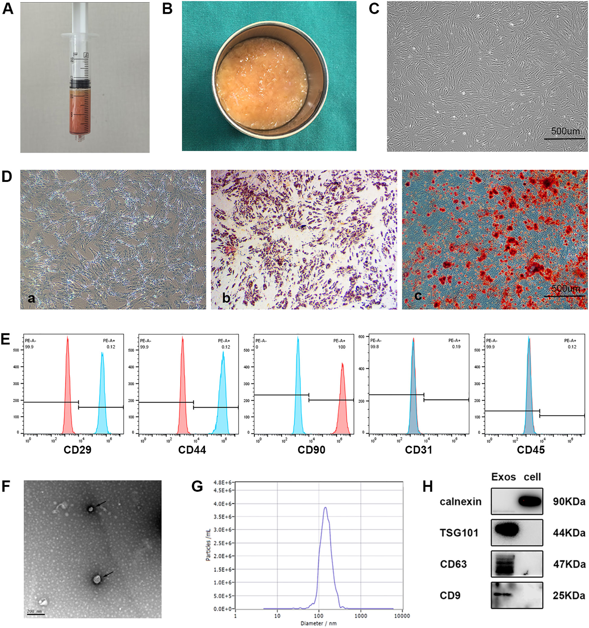 Figure 2. Characterization of ADSCs and exosomes. (A) Collection of adipose tissue obtained immediately by liposuction. (B) Adipose tissue after oil and water removal. (C) Representative image showing the typical spindle-like shape of isolated ADSCs under a light microscope. (D) Representative images of ADSCs differentiated into chondrocytes, osteogenic cells, and adipocytes, stained with Alcian Blue (a), Alizarin Red S (b), and Oil Red O (c), respectively. (E) Flow cytometry showed that CD29, CD44 and CD90 was positive and CD31, or CD45 was negative among the surface markers ADSCs. (F) Transmission electron microscopy (TEM) image of ADSCs derived exosomes revealing cup-shaped morphology (black arrows). (G) Nanoparticle tracking analysis (NTA) showing the size distribution of ADSCs derived exosomes. (H) Western blot analysis of CD63, TSG101, CD9, calnexin in ADSC-Exos and ADSCs (n = 3 per group).