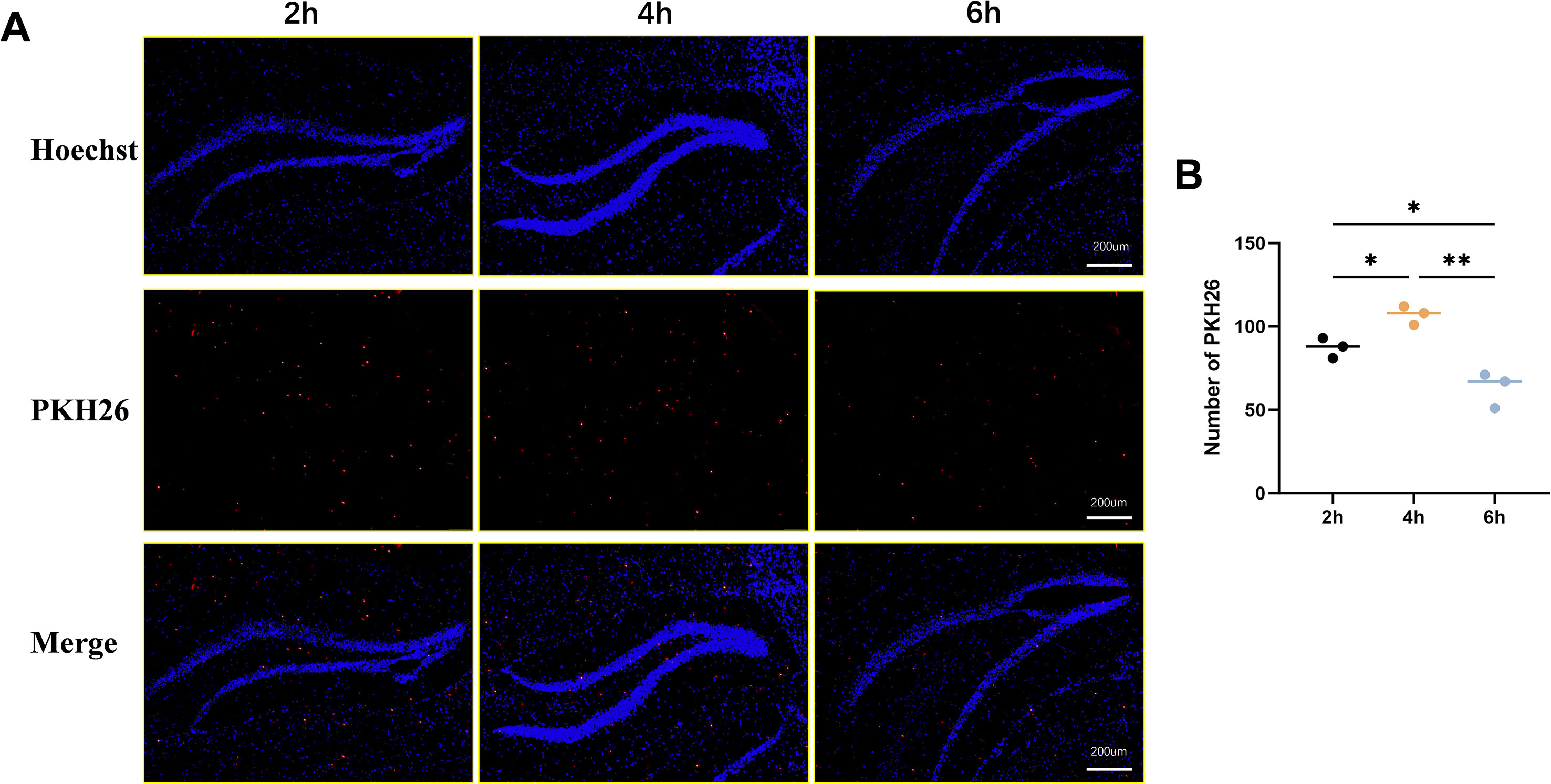 Figure 3. PKH26 labeling to depict ADSC-Exos in brain parenchyma. (A) Representative image shows that PKH26-labeled ADSC-Exos cross the blood-brain barrier and accumulate in brain tissue over time. Fluorescence images show PKH26-labeled exosomes (red) in brain tissue at 2, 4, and 6 h post-injection (left to right). Nuclei were stained with Hoechst (blue). Strongest exosome accumulation was observed at 4 (h) (B) Quantitative analysis of the relative expression of PKH26-labeled ADSC-Exos in Hippocampus. Individual data points represent values from each mouse (n=3 per group). Data are expressed as mean ± SD. *p < 0.05, **p < 0.01(one-way ANOVA with Tukey’s post hoc test).