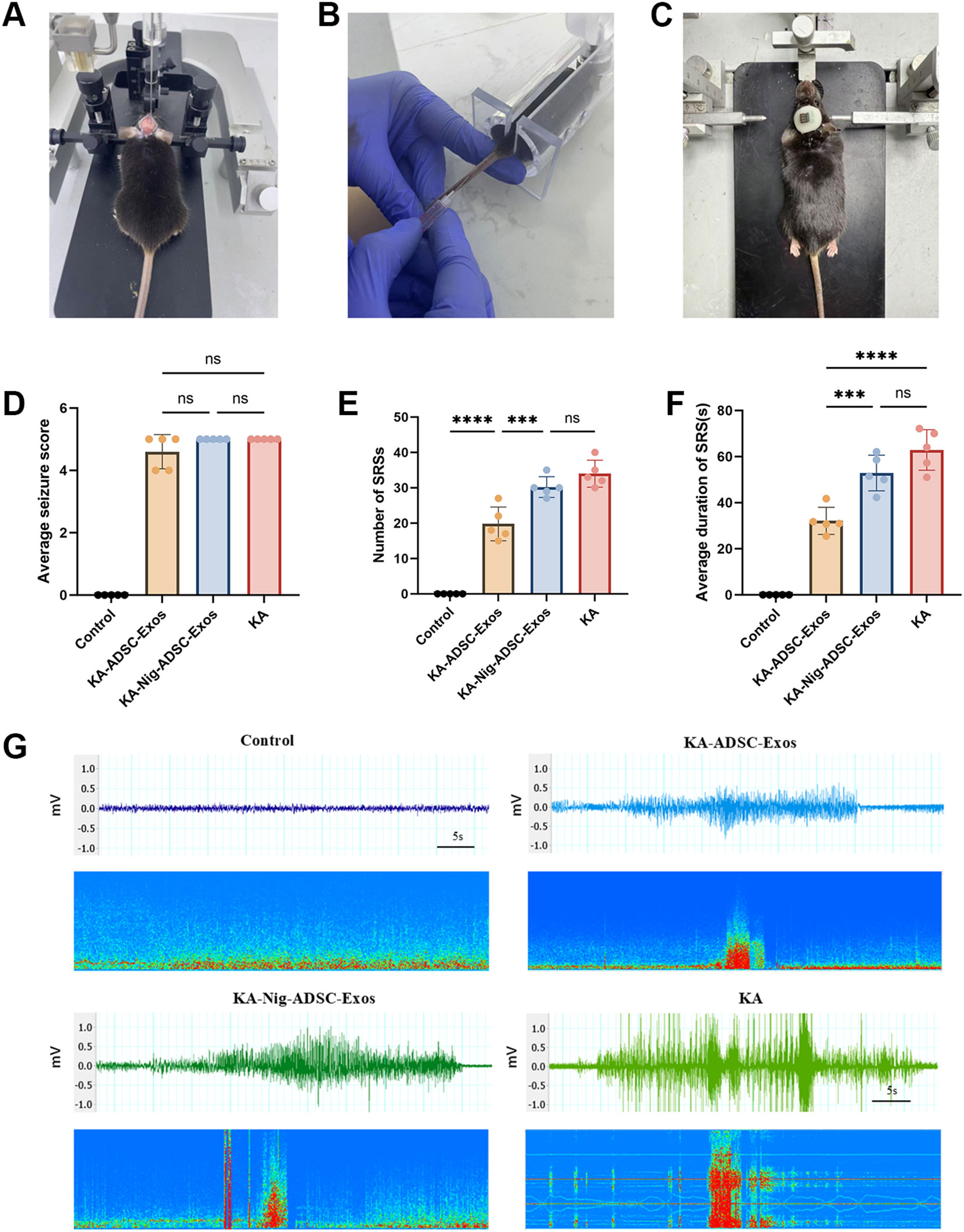 Figure 4. Therapeutic effects of ADSC-Exos on seizure activity in KA-induced temporal lobe epilepsy (TLE) mice. (A) Stereotaxic intrahippocampal KA injection (coordinates: AP −2.0 mm, ML −1.8 mm [right hemisphere], DV −1.8 mm). (B) Intravenous administration of ADSC-Exos via tail vein. (C) Surgical implantation of epidural EEG electrodes. (D–F) Quantitative analyses of (D) average seizure scores on Day 1 post-KA injection, (E) frequency of SRSs during the chronic phase (days 14–21), and (F) mean duration of spontaneous recurrent seizures (SRSs). Individual data points represent values from each mouse (n=5 per group). Data are expressed as mean ± SD. Statistical significance: *p < 0.05, **p < 0.01, ***p < 0.001, ****p < 0.0001(one-way ANOVA with Tukey’s post hoc test). (G) Representative 1-minute EEG traces during epileptic episodes.