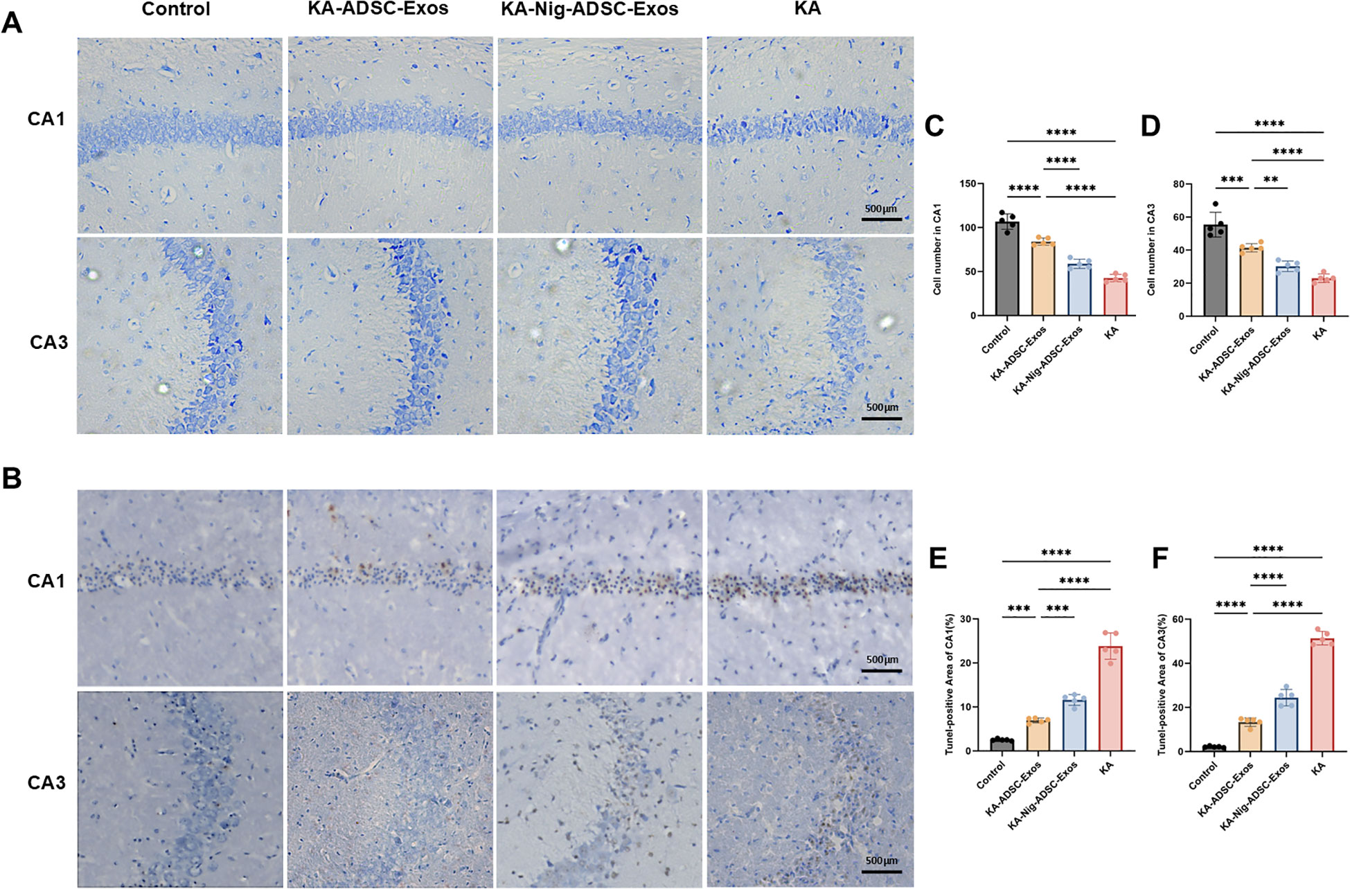 Figure 5. Effects of ADSC-Exos on KA-induced hippocampal neuron damage. (A) Representative Nissl-stained images (200×) showing ADSC-Exos attenuated KA-induced neuron loss in hippocampal CA1 and CA3 regions. (B) Representative TUNEL-stained images (200×) showing ADSC-Exos alleviated KA-induced apoptosis in CA1 and CA3. (C–F) Quantitative analyses of (C) CA1 Nissl+, (D) CA3 Nissl+, (E) CA1 TUNEL+, and (F) CA3 TUNEL+ cells. Individual data points represent values from each mouse (n=5 per group). Data are expressed as mean ± SD. *p < 0.05, **p < 0.01, ***p < 0.001, ****p < 0.0001 (one-way ANOVA with Tukey’s post hoc test).