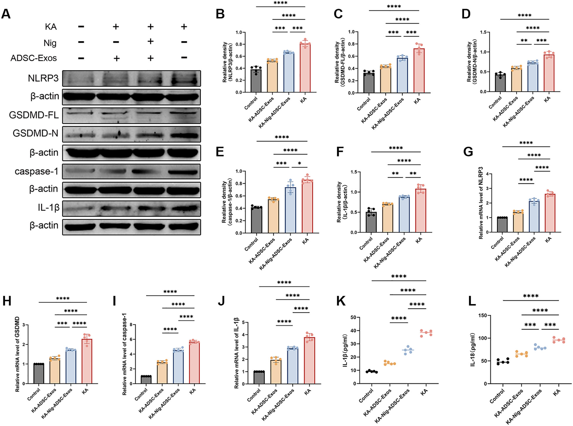 Figure 6. ADSC-Exos mitigate NLRP3-mediated pyroptosis in KA-induced temporal lobe epilepsy. (A–F) Western blot analysis and quantification of (A) representative immunoblots and protein levels of (B) NLRP3, (C) GSDMD-FL, (D) GSDMD-N, (E) Caspase-1, and (F) IL-1β in the Control, KA, KA+ADSC-Exos, and KA+Nig+ADSC-Exos groups. (G–J) qRT-PCR analysis of relative mRNA expression of (G) NLRP3, (H) GSDMD, (I) Caspase-1, and (J) IL-1β. (K–L) ELISA quantification of (K) serum IL-1β and (L) IL-18 levels. Individual data points represent values from each mouse (n=5 per group). Data are expressed as mean ± SD. *p < 0.05, **p < 0.01, ***p < 0.001, ****p < 0.0001 (one-way ANOVA with Tukey’s post hoc test).