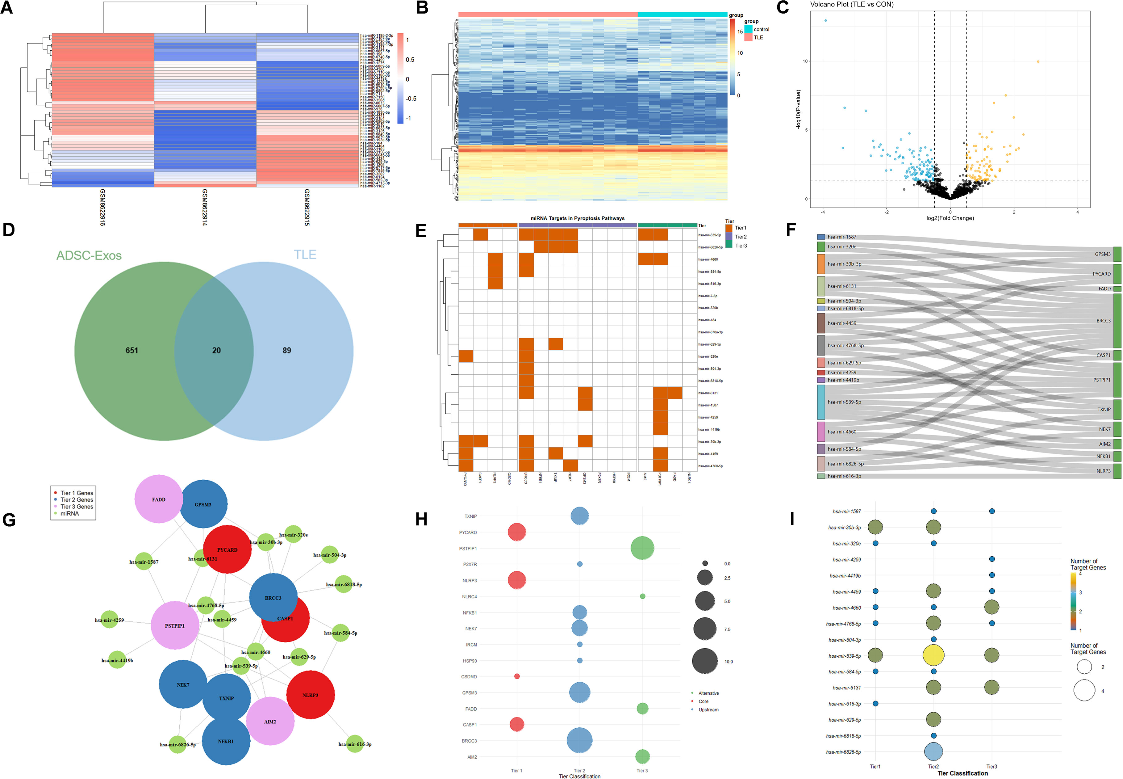 A series of scientific data visualizations related to gene and microRNA analysis: A) Heatmap showing expression levels across samples. B) Heatmap highlighting group differences between control and TLE. C) Volcano plot depicting differential expression with log2 fold changes. D) Venn diagram comparing two datasets, ADSC-Exos and TLE, with intersecting genes. E) Heatmap of miRNA targets in pathways. F) Sankey diagram illustrating miRNA and gene interactions. G) Network graph of miRNA-gene interactions by tier classification. H) Bubble plot showing tier classification with alternative, core, and upstream distinctions. I) Bubble plot highlighting the number of target genes by miRNA.